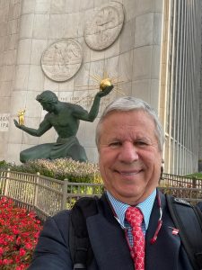 Steve Majoros, vicepresidente y director de marketing de Chevrolet, habla con los miembros de la prensa durante el Salón Internacional del Automóvil de Norteamérica 2022 dentro del centro de convenciones Huntington Place en Detroit el miércoles, 14 de septiembre de 2022. El Chevy Equinox 2024, el primero en la historia Equinox eléctrico se muestra detrás de Majoros.