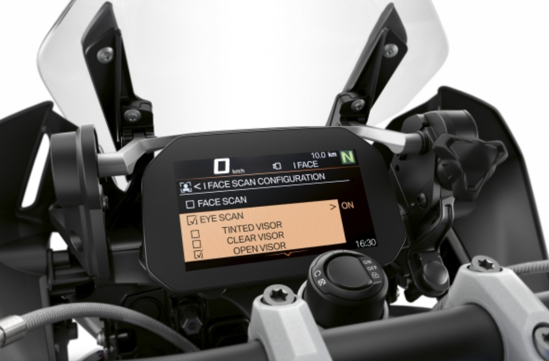 El reconocimiento facial utiliza la última tecnología 3D integrada en la ultramoderna pantalla TFT de BMW Motorrad, que no es visible desde el exterior. Esto se lleva a cabo mediante proyección de bandas, una tecnología que se ha utilizado durante muchos años, por ejemplo, en ingeniería inversa. Con el casco quitado, la cara se escanea tridimensional y biométricamente.