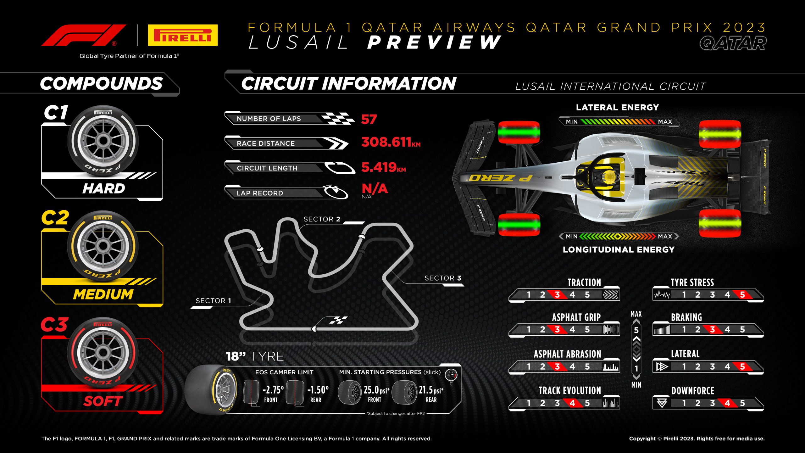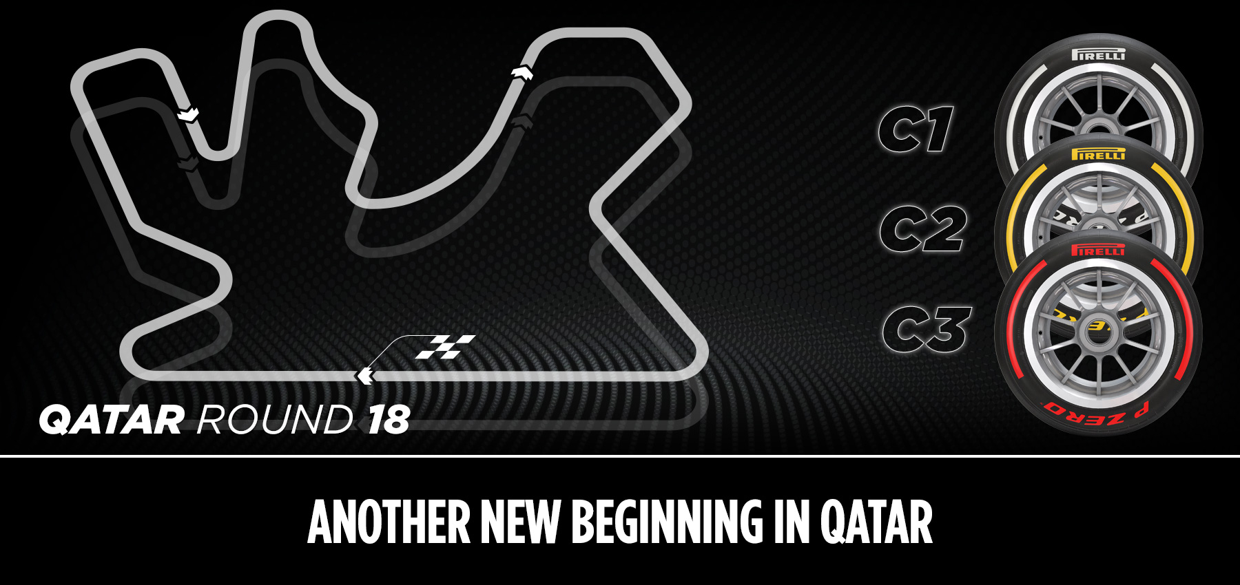 - Para el Gran Premio de Qatar, los equipos tendrán el C1 como P Zero Blanco duro, el C2 como P Zero Amarillo medio y el C3 como P Zero Rojo blando. Esta es la misma nominación hecha para la carrera anterior, en Japón.