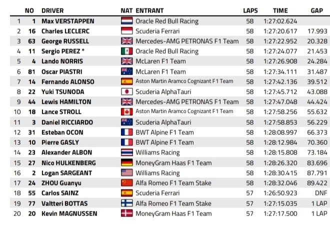 Norris terminó la carrera en quinto lugar por delante de su compañero de equipo Oscar Piastri, con Fernando Alonso de Aston Martin en séptimo lugar. Yuki Tsunoda, Hamilton y Lance Stroll (Aston Martin) de AlphaTauri completaron el top 10.