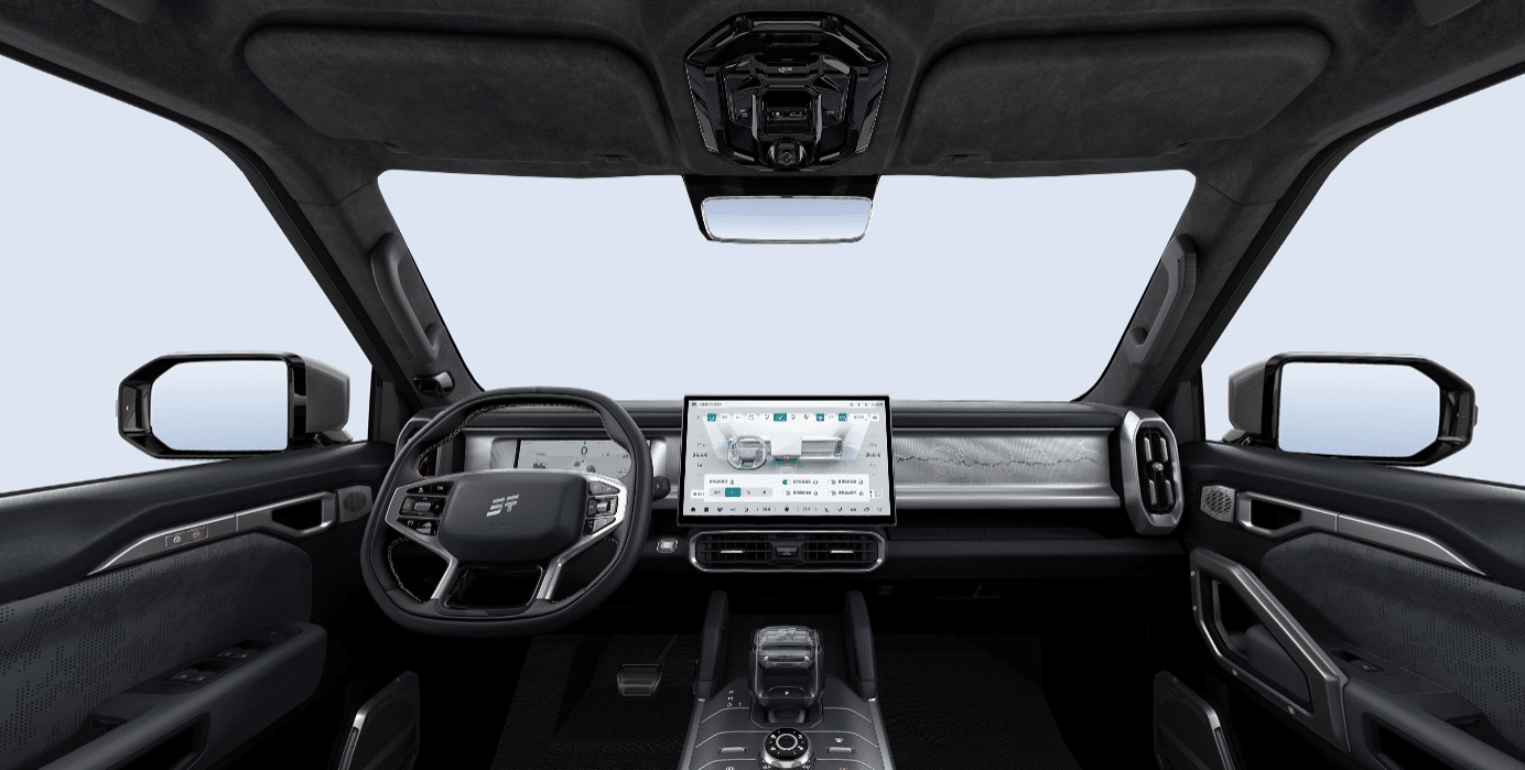 El Shanhai T2 tiene un ángulo de ataque de 28°, un ángulo de salida de 30°, una distancia mínima al suelo de 205 mm. Se ofrecen dos especificaciones de neumáticos: 255/55 R20 y 255/60 R19. Tampoco falta un techo corredizo panorámico de 64 pulgadas.