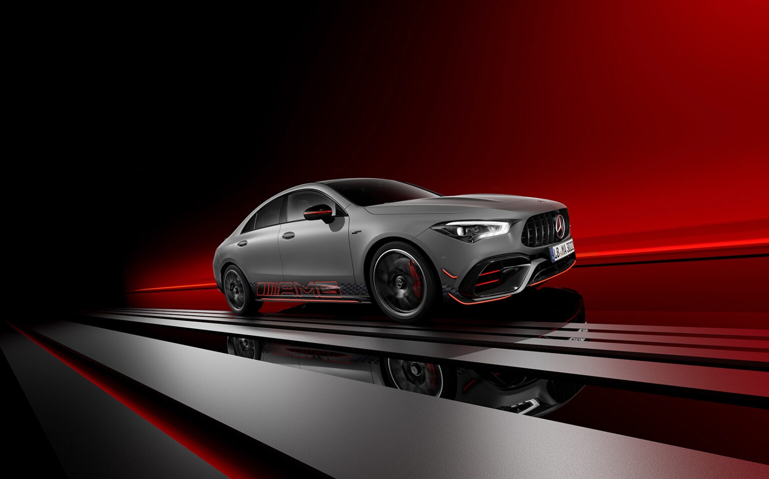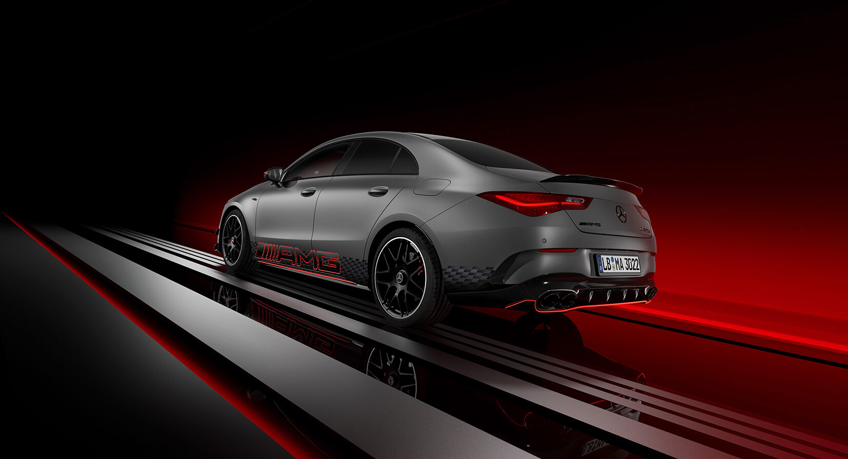 La pintura MANUFAKTUR Mountain Grey Magno y los gráficos a lo largo del perfil del vehículo con el logotipo AMG y el motivo AMG en el diseño de la bandera de cuadros enfatizan el carácter dinámico de la Edición 1. Esto se ve aún más subrayado por los detalles de diseño exclusivos en naranja, el AMG Night Package Plus, y el paquete aerodinámico AMG con un divisor delantero más grande y un alerón trasero, entre otras mejoras aerodinámicas. Se montan aros de aleación forjados AMG de 19 pulgadas en diseño de radios cruzados en color negro mate y los calipers de freno AMG Performance rojos delanteros y traseros crean un atractivo contraste.