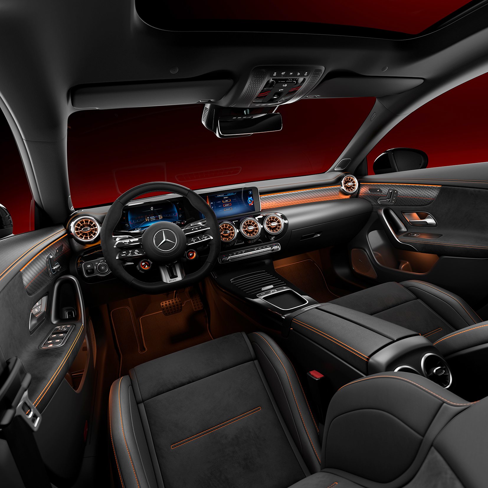 Elementos de diseño distintivos son visibles en todo el interior. Los asientos AMG Performance con tapicería de microfibra negra y costuras en naranja brindan un excelente soporte durante la conducción dinámica. La marca en naranja adorna los apoyacabezas integrados. Los detalles llamativos se extienden aún más al panel de instrumentos con costuras en contraste naranja, paneles de umbral de las puertas AMG iluminados en rojo e iluminación roja específica de la Edición 1. Otros aspectos destacados del interior son el volante AMG Performance en cuero Nappa/microfibra y elementos de adorno AMG en aluminio y negro, que complementan el mismo estilo que la decoración exterior.