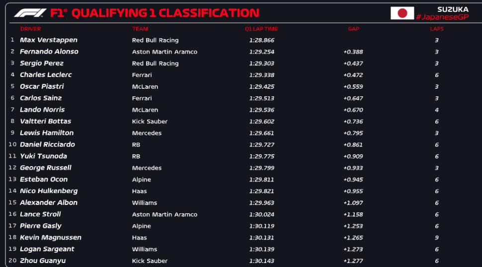 Max Verstappen salió inmediatamente como un martillo y marca el ritmo en 1.28.866 delante de Fernando Alonso, luego Checo Pérez a casi medio segundo, Oscar Piastri y Carlos Sainz continúan la lista terminando pegado a unas buenas seis décimas. En esta primera tanda Charles Leclerc cae algunas en dificultades termina cuarto en la Q1 por más de un segundo y entre los dos Ferrari se encuentran del séptimo a la décima posición la lucha queda con Norris, Hamilton, Russell y Tsunoda.