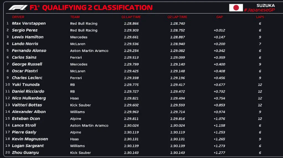 Pole position en 1.28.197 para Max Verstappen, que suma cuatro de cuatro al inicio de 2024. El holandés tuvo que sudar porque su compañero Sergio Pérez, segundo, era muy rápido, a sólo 63 milésimas. Tercero fue un excelente Lando Norris que puso su McLaren por delante del Ferrari de Carlos Sainz. Fernando Alonso la sitúa en quinta posición, a sólo 4 milésimas de Carlos, mientras que detrás de él encontramos muy cerca a Piastri y luego a Hamilton, sexto y séptimo respectivamente. Charles Leclerc sube a la octava posición y consigue, al menos, mantenerse por delante de George Russell, noveno, y Yuki Tsunoda, ídolo local, décimo.
