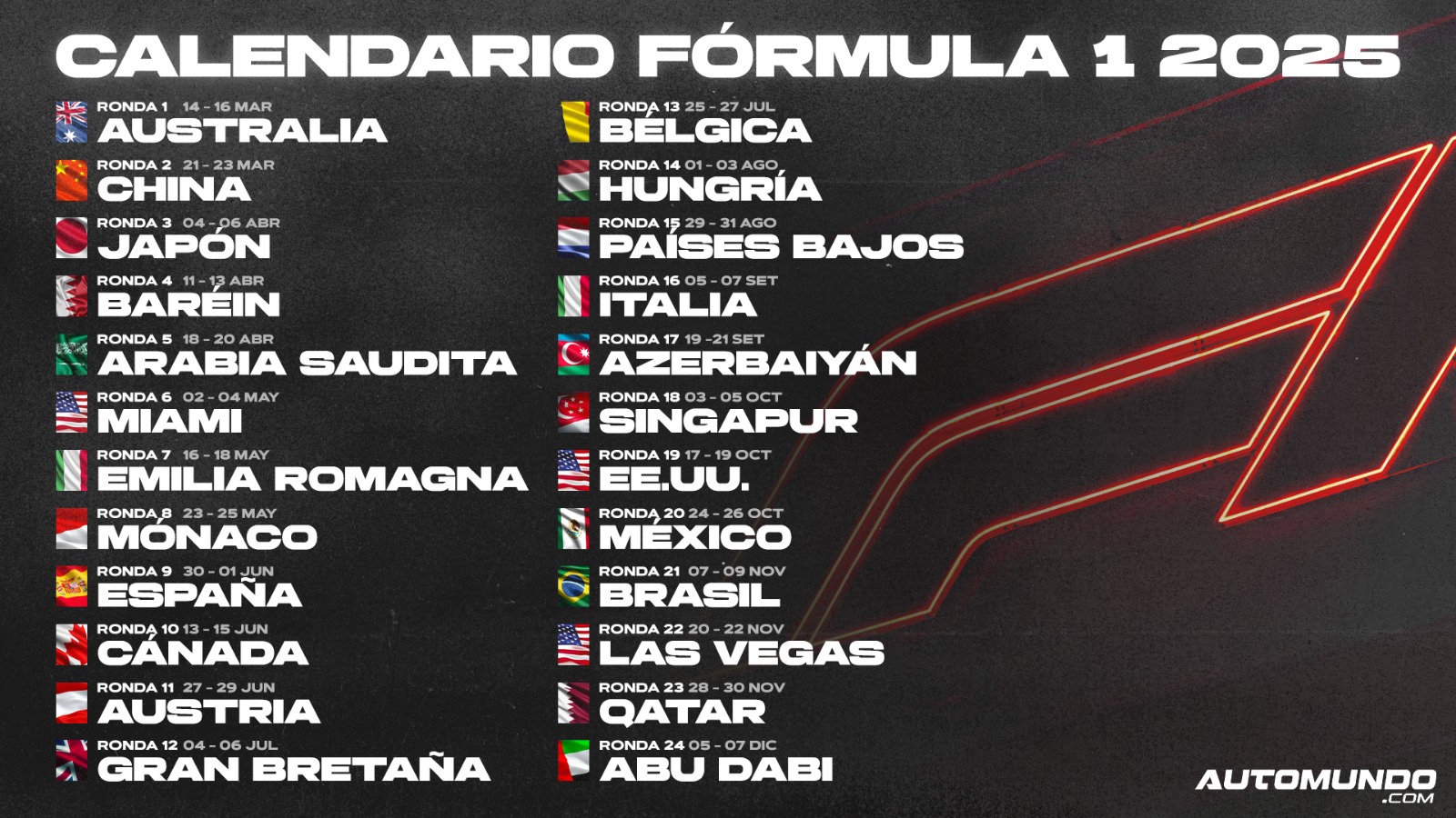 El Mundial de 2025 comenzará dos semanas después (14/16 de marzo) y finalizará el mismo fin de semana (5/7 de diciembre). Esto significa que estará más comprimido y verá más consolidaciones al comienzo de la temporada.