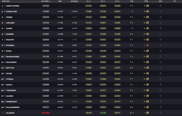 Aunque la carrera tardó mucho en ponerse en marcha, los espectadores disfrutaron de una magnífica batalla a cuatro bandas por el podio. Mientras Alonso se defendía como un león contra Carlos Sainz , los dos españoles acabaron llegando al contacto, sobre todo por el legendario y magnífico extremismo del piloto de Aston Martin. Con esa lucha, en una emboscada, Checo Pérez aprovechó para robarles el tercer puesto a los dos, mientras que Alonso en poco minutos se vio obligado a retirarse por un pinchazo.