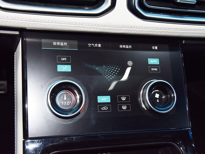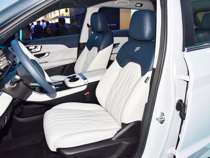 El interior del L7 mostrado en la feria tenía un interior blanco y azul con bordados, la novedad es que tiene una gran pantalla dual con una pantalla de instrumentos del mismo tamaño y una unidad de infoentretenimiento que en la configuración hace que fluyan entre sí. Debajo hay una pantalla para el control del del aire acondicionado y el climatizador que parece integrar un par de diales con un enfoque de diseño bastante innovador.