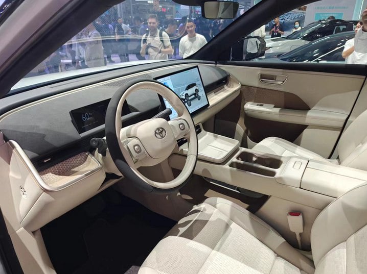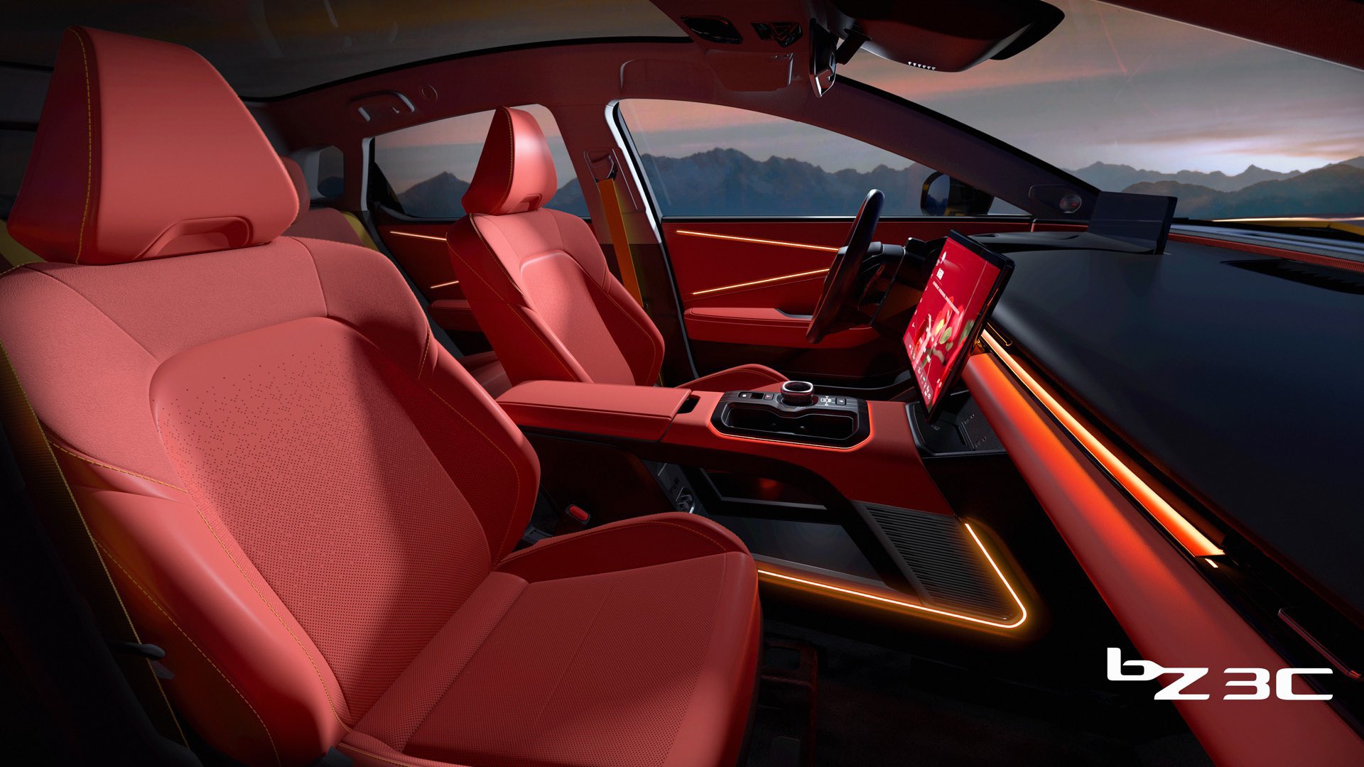 El interior del modelo de exhibición tiene un interior rojo intenso. Hay una consola central flotante y una pantalla de información y entretenimiento. En particular, el panel de instrumentos parece estar muy atrás en el tablero hacia el parabrisas. El bZ3C será producido por FAW Toyota y probablemente saldrá a la venta en la segunda mitad del año.