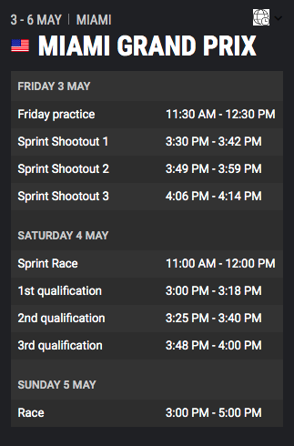 El evento principal, la carrera del GP de Miami, comienza nuevamente el domingo 5 de mayo a las 4 pmEDT .