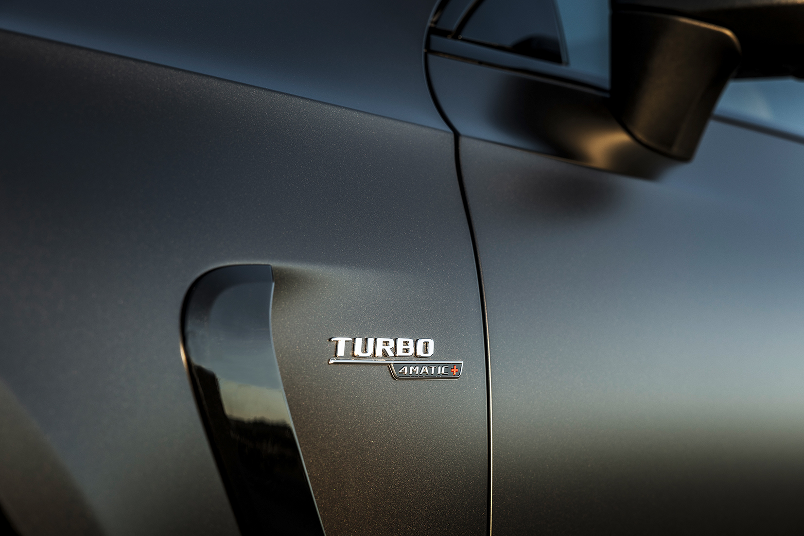 La parte delantera progresivamente inclinada hacia delante («nariz de tiburón» algo parecida a la del BMW M4) , en combinación con el capó de forma precisa, contribuye a una apariencia refinada y atlética. La parrilla del radiador específica de AMG y los faros LED planos y de líneas marcadas confieren una estética especialmente poderosa. Como equipamiento opcional están disponibles los faros DIGITAL LIGHT con función de proyección. Estos cuentan con elipses de luz de circulación diurna y una iluminación azul de la base de los faros, lo que realza el aspecto dinámico.