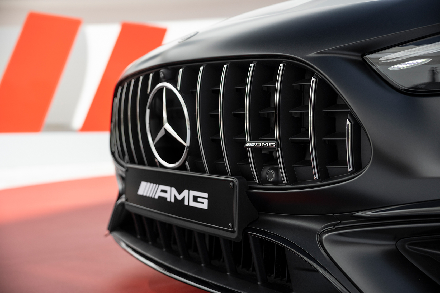 La parte delantera progresivamente inclinada hacia delante («nariz de tiburón» algo parecida a la del BMW M4) , en combinación con el capó de forma precisa, contribuye a una apariencia refinada y atlética. La parrilla del radiador específica de AMG y los faros LED planos y de líneas marcadas confieren una estética especialmente poderosa. Como equipamiento opcional están disponibles los faros DIGITAL LIGHT con función de proyección. Estos cuentan con elipses de luz de circulación diurna y una iluminación azul de la base de los faros, lo que realza el aspecto dinámico.