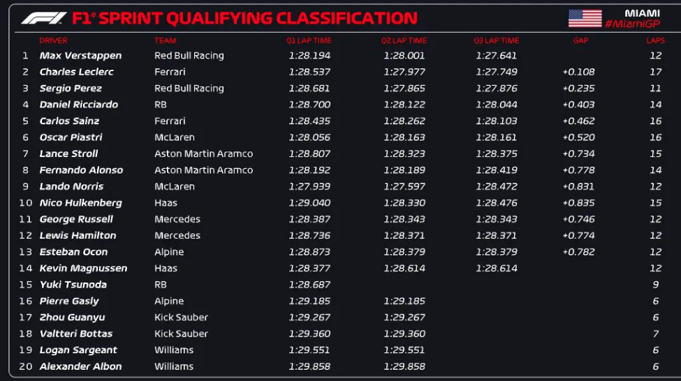 Max Verstappen partirá desde la pole en el sprint del GP Miami 2024. El tres veces campeón del mundo, no señalado como favorito al inicio del SQ3, en cambio subvirtió los pronósticos al lograr la mejor marca en 1:27.641, con una décima de una ventaja sobre Charles Leclerc. El monegasco, después del grave error de la mañana que le quitó toda la hora de entrenamientos libres de que disponía, se recuperó al menos en la vuelta rápida, aunque luego habrá que evaluar su ritmo de carrera ante la falta de kilómetros.