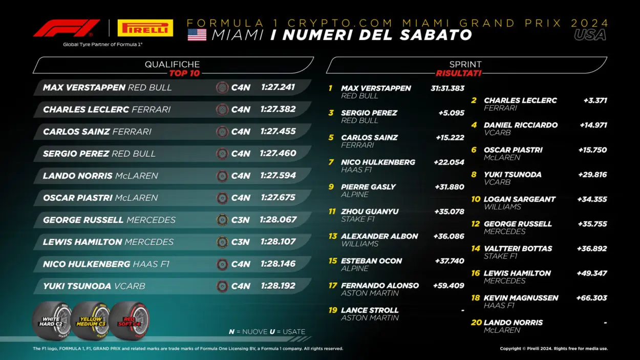 La Carrera Sprint vio, como era de esperar, el Medio como protagonista absoluto de las elecciones de pilotos y equipos. De hecho, dieciocho pilotos completaron las 19 vueltas previstas con el compuesto central de los tres traídos a Miami por Pirelli: las únicas excepciones fueron Tsunoda y Sargeant, que optaron por el blando. A pesar de las altas temperaturas – incluso hoy superaron los 55° C – el rendimiento del C4 fue más que decente, hasta el punto de que tanto los pilotos de Racing Bulls como los de Williams ganaron varias posiciones, logrando los japoneses también hacerse con el octavo y último puesto. disponible en los puntos.