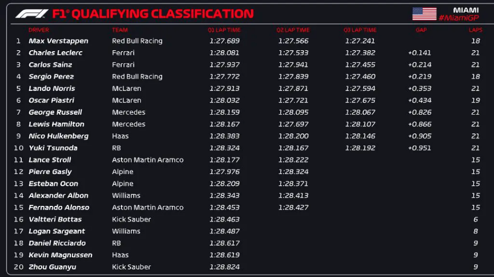 Los dos Alpine quedaron eliminados en la Q2. Si bien el Atlético pensó durante un tiempo que podía luchar por el acceso a la Q3, finalmente se quedó fuera de los dos monoplazas franceses por una décima para empezar entre los 10 primeros. Pierre Gasly partirá 12º, por delante de Esteban Ocon (13º). Por segunda vez consecutiva tras la clasificación al sprint, Lance Stroll (11º) volvió a dominar a Fernando Alonso (15º), quien claramente no se encuentra cómodo este fin de semana en la pista de Florida.