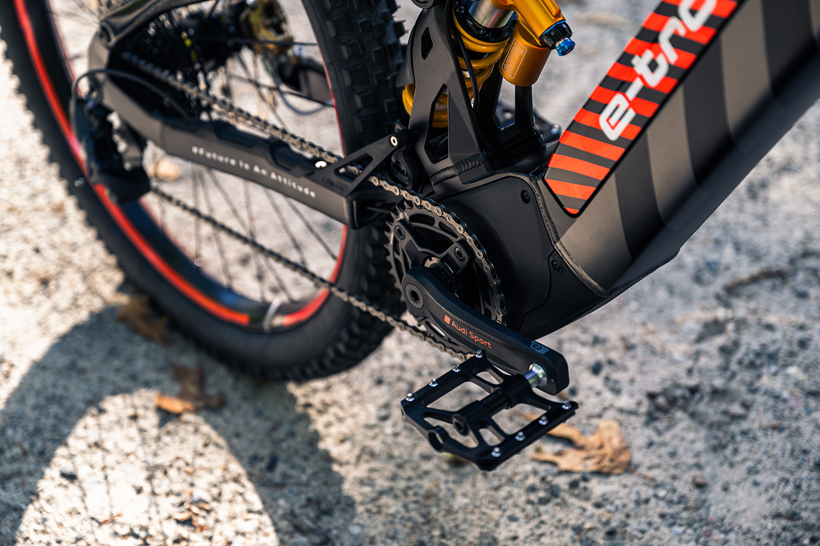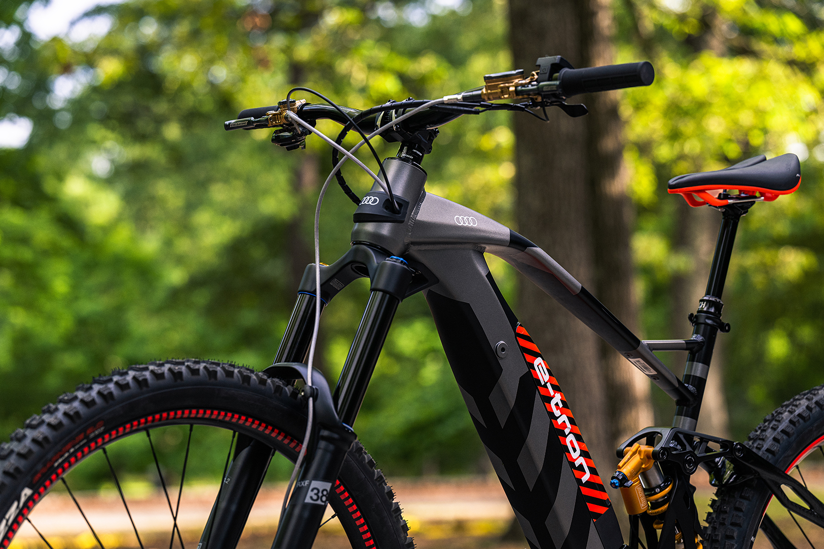 Gracias a su diseño de suspensión total, ruedas Mavic sin cámara específica para bicicletas eléctricas y neumáticos todoterreno Vittoria aptas para bicicletas eléctricas, se siente perfectamente como en casa en una variedad de terrenos, desde carriles bici y turismo hasta desafiantes terrenos todoterreno. pistas de carretera. Equipado con componentes de suspensión totalmente ajustables de primera categoría y con 180 mm de recorrido, el Audi eMTB se distingue por un amortiguador trasero Öhlins TTX22m.2 con resorte helicoidal y una horquilla Öhlins RXF38 m.2 con resorte neumático. Las tareas de cambio para la transmisión 1×12 son manejadas por el desviador trasero GX de SRAM y la palanca de cambios montada en la barra, trabajando a través de un casete trasero de 11-51 dientes. La potencia de frenado la proporciona las PRIMERAS pinzas de Sunstar Braking y los rotores S3 Batfly (220/203 mm F/R).