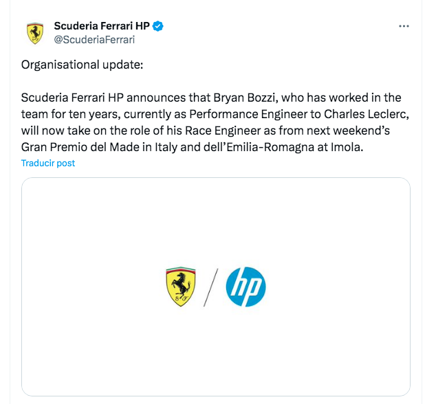 Con dos comunicados de prensa separados, Ferrari ha hecho saber que, procedente del GP de Emilia Romagna, el ingeniero de pista de Charles Leclerc ya no será Xavi Marcos.