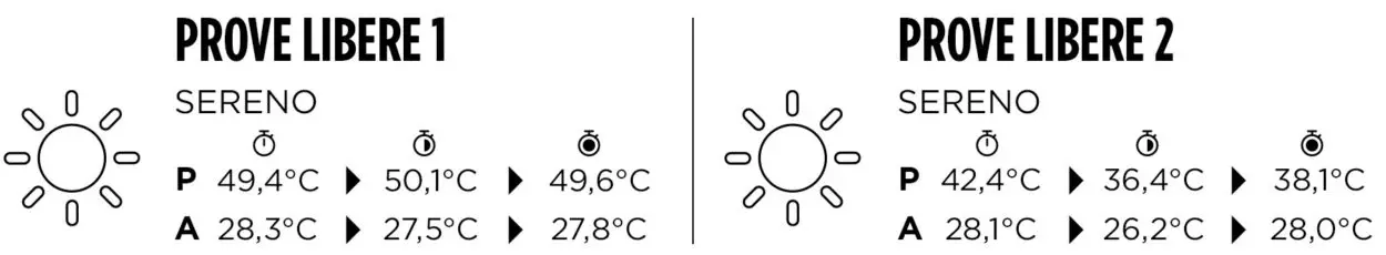 Como era de esperar , también debido a la fuerte lluvia que cayó ayer, la pista en la primera sesión todavía estaba bastante «verde» y el agarre que ofrecía el asfalto aumentaba rápidamente a medida que los coches circulaban. Esta rápida evolución de las condiciones de la pista también continuó en la segunda sesión, aunque en menor medida. El viento fue un factor perturbador, especialmente en la FP1, con las temperaturas permaneciendo bastante estables en torno a 27/28 °C en cuanto al aire, mientras que pasaba de una media de 50 °C en la primera sesión a 39 °C en la segunda, condiciones que podrían ser bastante similares a los esperados para la carrera del domingo.