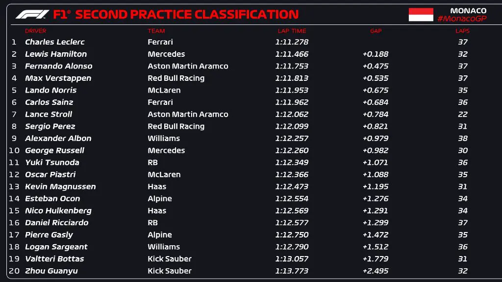 Leclerc marcó un tiempo de 1:11.278, un tiempo un segundo más rápido que en la misma sesión de 2023, como ya había ocurrido en la FP1. El monegasco de Ferrari presionó fuerte en casi todas las vueltas, asumiendo también varios riesgos con un par de pérdidas de control y un tiro lejano en Sainte Devote.