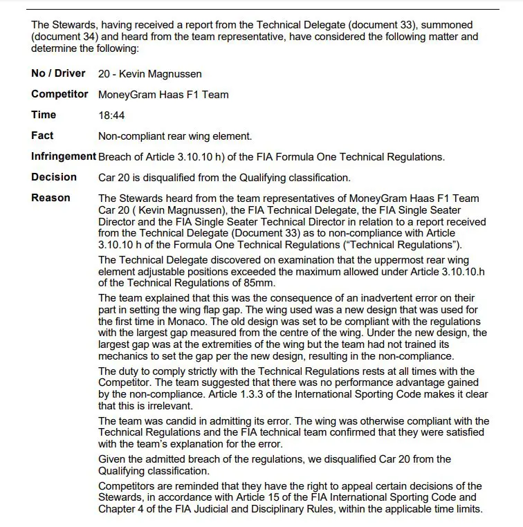 Se ha confirmado la infracción técnica en la medida de la apertura de la trampa superior, por lo cual los dos Hass han sido descalificados tras obtener 12º y 15º lugar en la ronda de calificaciones.