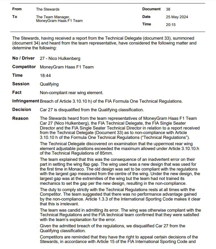 El Haas de Nico Hulkenberg y Kevin Magnussen han sido descalificados del resultado de clasificación del GP de Mónaco 2024 debido a una infracción técnica relacionada con el DRS.