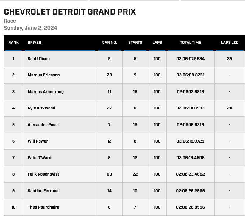 Ericsson aprovechó al máximo su última vuelta, reduciendo el margen de Dixon a más de la mitad. Aún así, no fue suficiente para alcanzar a “The Iceman”, aunque Ericsson estaba emocionado de recuperarse de las 500 Millas de Indianápolis, en las que fue eliminado en la vuelta 1 después de quedar atrapado en el trompo de Tom Blomqvist.
