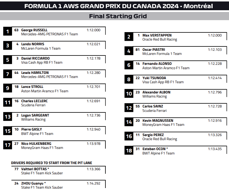 A continuación les mostramos la parrilla de salida del GP de Canadá de 2024, novena prueba del campeonato mundial de Fórmula 1 que comenzará a las 13 horas (hora de Perú) en el circuito que lleva el nombre del «principito» Gilles Villeneuve, incluidas la penalidad a Esteban Ocón (5 puestos por el accidente en Mónaco) y la salida de los Sauber desde el pit lane por los cambios en hechos en sus unidades de potencia luego de la Q3 según la reglamentación de la F1.