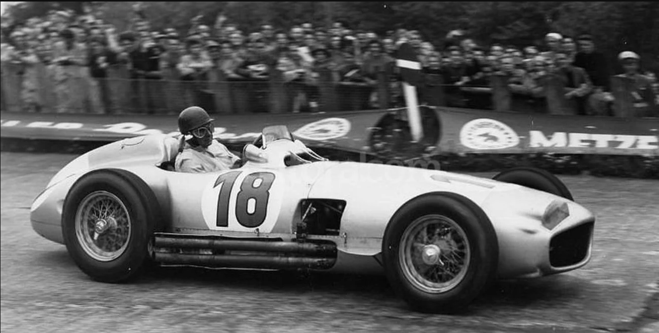 Quedó segundo en el campeonato en 1950 y ganó su primer título en 1951. Estaba compitiendo bien en 1952 con un Maserati hasta que un grave accidente en Monza, Italia, acabó su temporada con una lesión en el cuello. En 1954 regresó, corriendo con un Maserati hasta que entró Mercedes-Benz a mitad de temporada. Ganó ocho de doce carreras (seis de ocho en el campeonato) ese año y continuó compitiendo nuevamente con Mercedes, conduciendo el magnífico W196 Monoposto, en 1955 en un equipo que incluía a Stirling Moss. Al final de la segunda exitosa temporada, eclipsada por el desastre de Le Mans de 1955, en el que murieron 81 espectadores, Mercedes había ganado todos los títulos y se retiró de las carreras porque ya no tenía nada que demostrar.