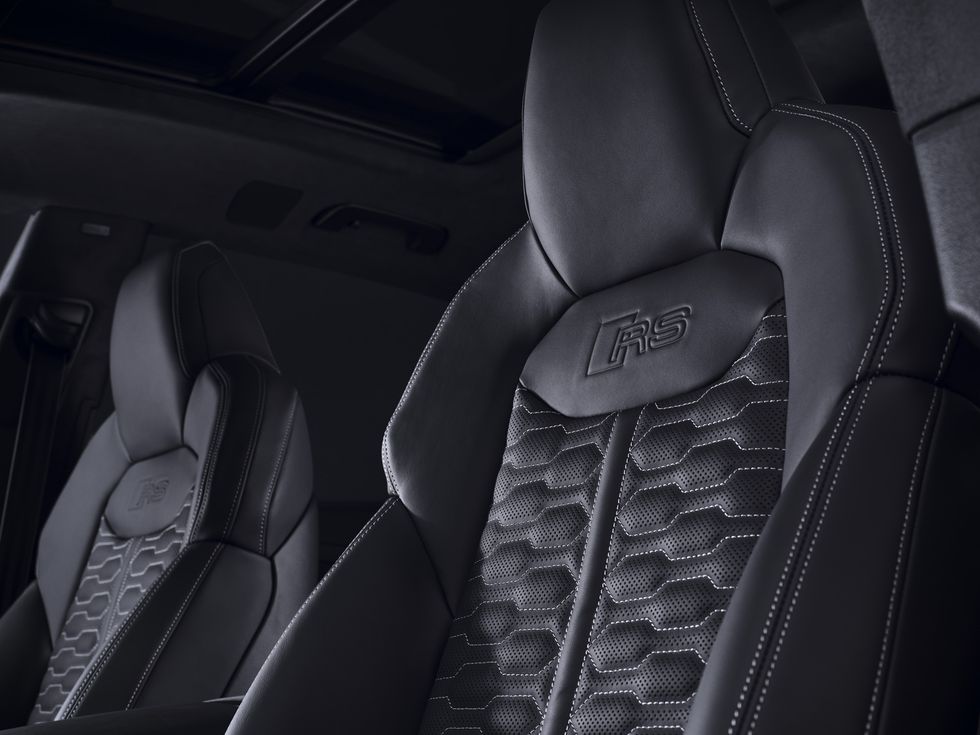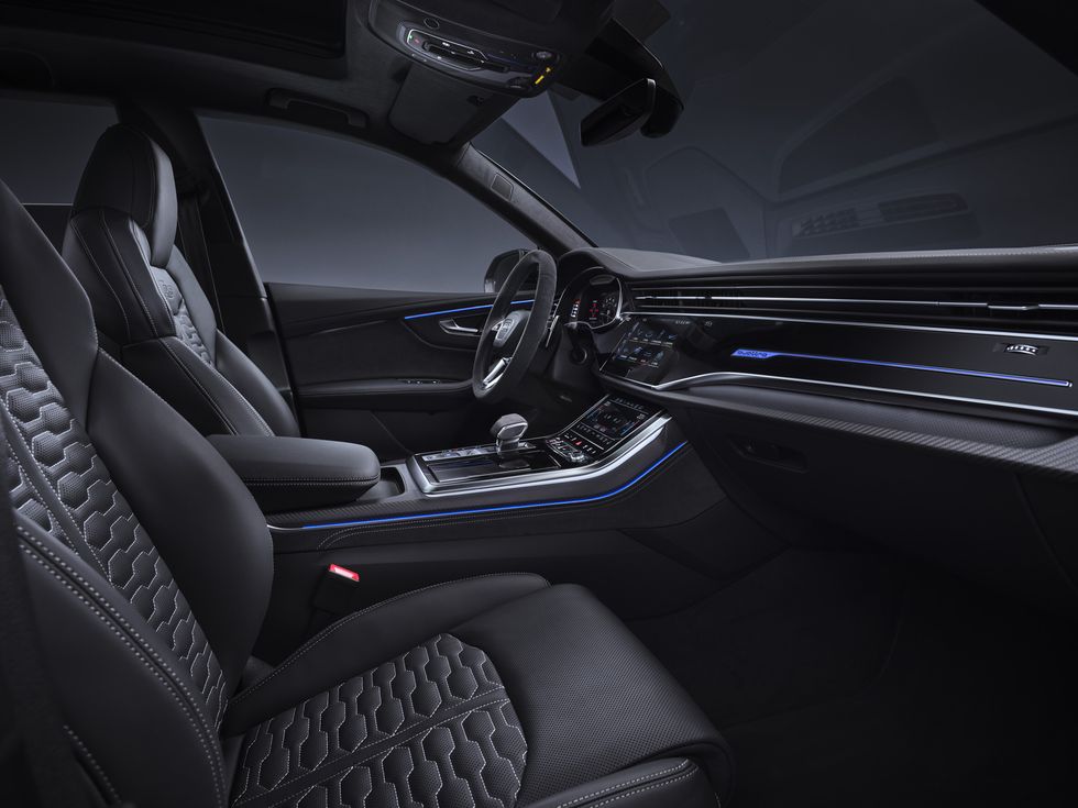 En el interior, Audi ofrece la posibilidad de elegir entre paquetes de diseño RS en rojo o gris. El color elegido pasa a ser el de las costuras en contraste de la consola central, las alfombras, los cinturones de seguridad y los propios asientos. El volante, la palanca de cambios y los lados de la consola central del RS Q8 están envueltos en microgamuza. Ese material se puede extender a más superficies, como los paneles de las puertas y los apoyabrazos centrales, con el paquete de diseño RS plus, que también viene en dos opciones de color: el elegido se muestra a través del centro de los asientos perforados y colorea el logotipo RS en relieve en el respaldar de los asientos.