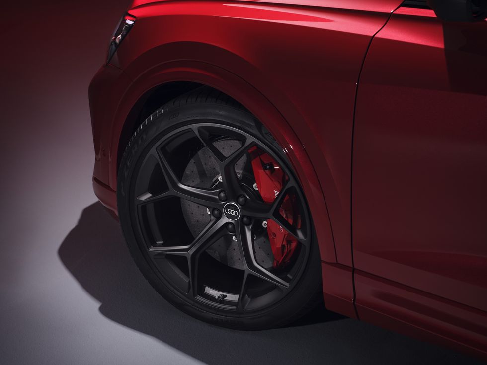 Junto con los aros estándar de 22 pulgadas, el RS Q8 Perfomance puede tener como opción aros forjados más grandes de 23 pulgadas. Audi afirma que las tareas de frenado son manejadas por calipers delanteros de 10 pistones, y un conjunto de rotores cerámicos de carbono que miden 17,3 pulgadas en la parte delantera y 14,6 pulgadas en la parte trasera están disponibles en el RS Q8 y son estándar en el Performance.