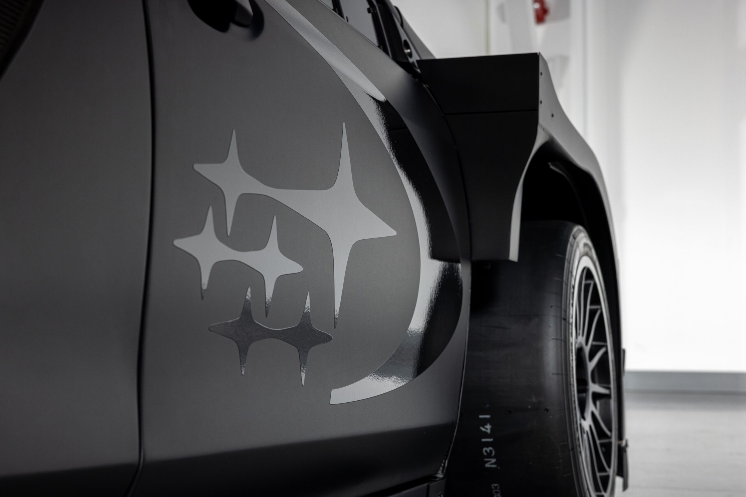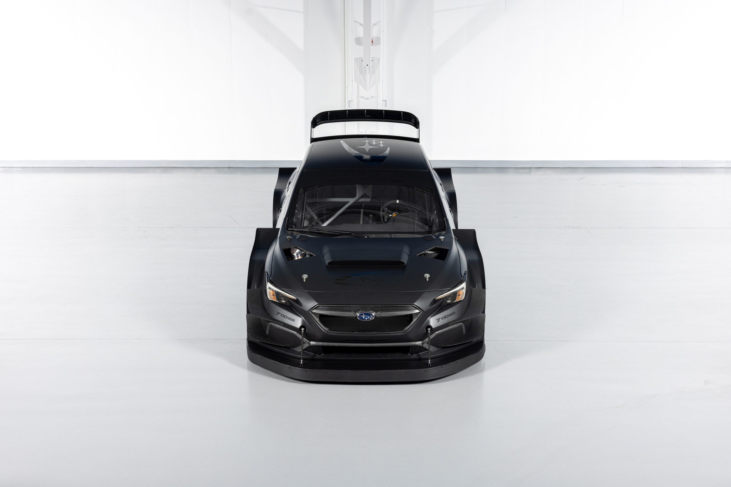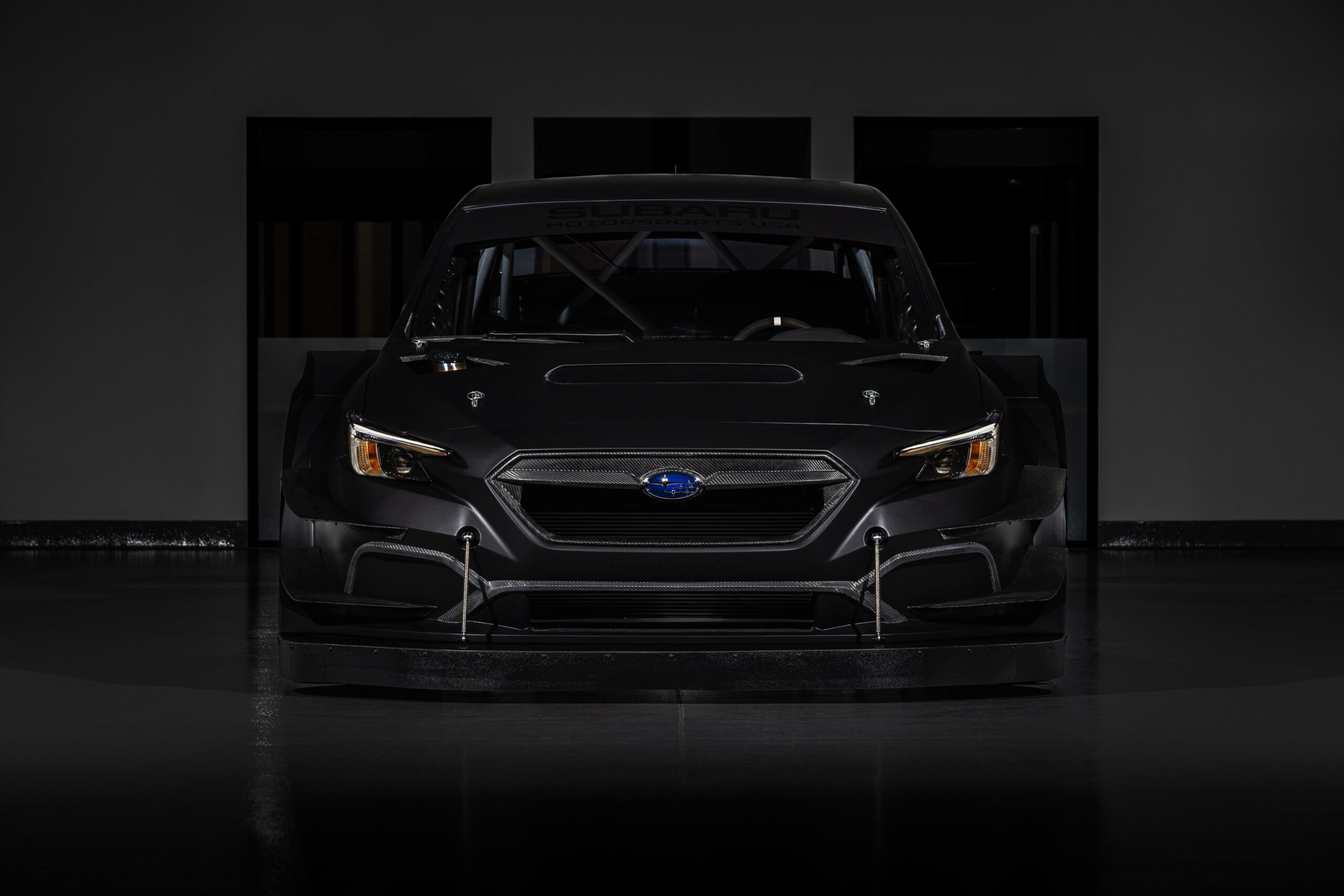 El Project Midnight cuenta con una carrocería aerodinámica ultra ancha y una versión radicalmente agrandada del alerón que se encuentra en el auto de rally de grava WRX ARA24 del equipo. La carrocería de fibra de carbono y un chasis significativamente aligerado le dan un peso en vacío de menos de 2500 libras, ¡casi 300 libras más ligero que el Airslayer y 1000 libras más ligero que un WRX estándar! El Project Midnight utiliza una geometría de suspensión de asfalto especialmente derivada y cambia el paquete de llantas y neumáticos de rallycross de 17 pulgadas del Airslayer por llantas de magnesio OZ Racing Superturismo LMP de 18×11 pulgadas y neumáticos lisos Yokohama ADVAN 280/650R18.