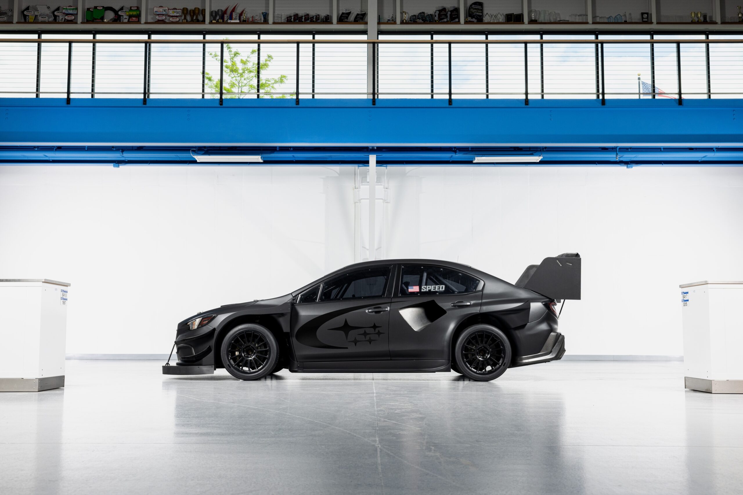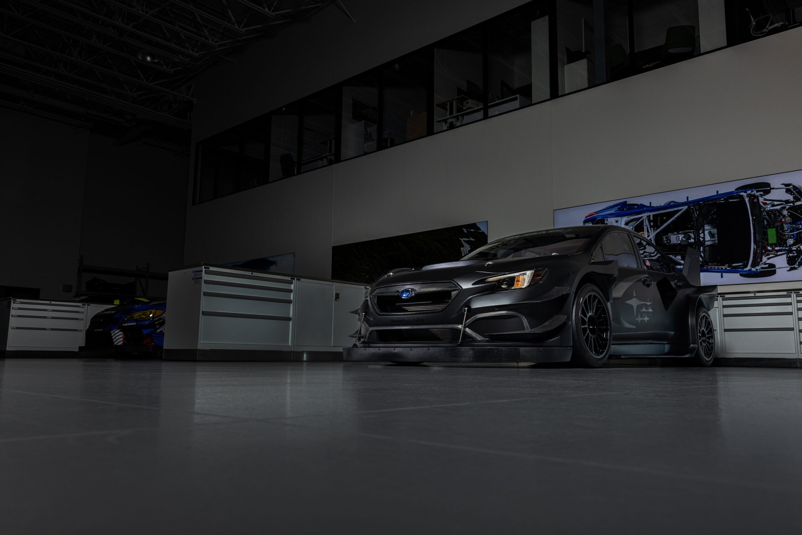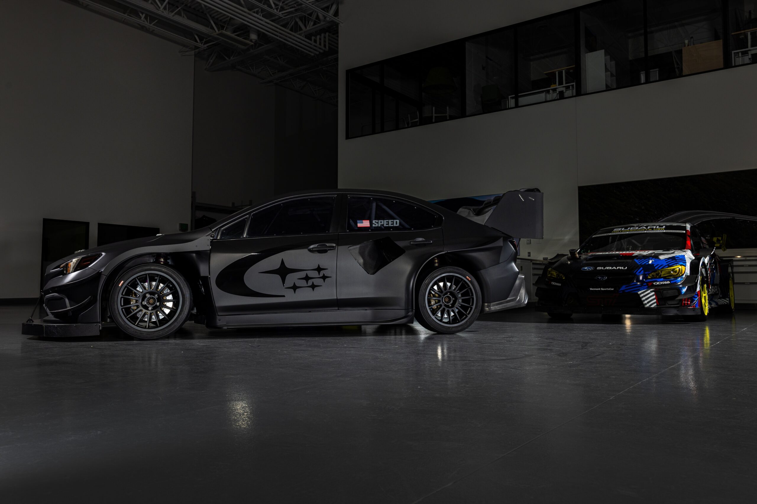 El Project Midnight cuenta con una carrocería aerodinámica ultra ancha y una versión radicalmente agrandada del alerón que se encuentra en el auto de rally de grava WRX ARA24 del equipo. La carrocería de fibra de carbono y un chasis significativamente aligerado le dan un peso en vacío de menos de 2500 libras, ¡casi 300 libras más ligero que el Airslayer y 1000 libras más ligero que un WRX estándar! El Project Midnight utiliza una geometría de suspensión de asfalto especialmente derivada y cambia el paquete de llantas y neumáticos de rallycross de 17 pulgadas del Airslayer por llantas de magnesio OZ Racing Superturismo LMP de 18×11 pulgadas y neumáticos lisos Yokohama ADVAN 280/650R18.
