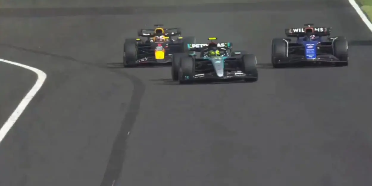 Empecemos por el principio: Verstappen tiene doble rebufo (también usa el de Albon) + DRS para acercarse a Hamilton. Después de haber rodado al tailandés, Lewis avanza hacia el exterior.