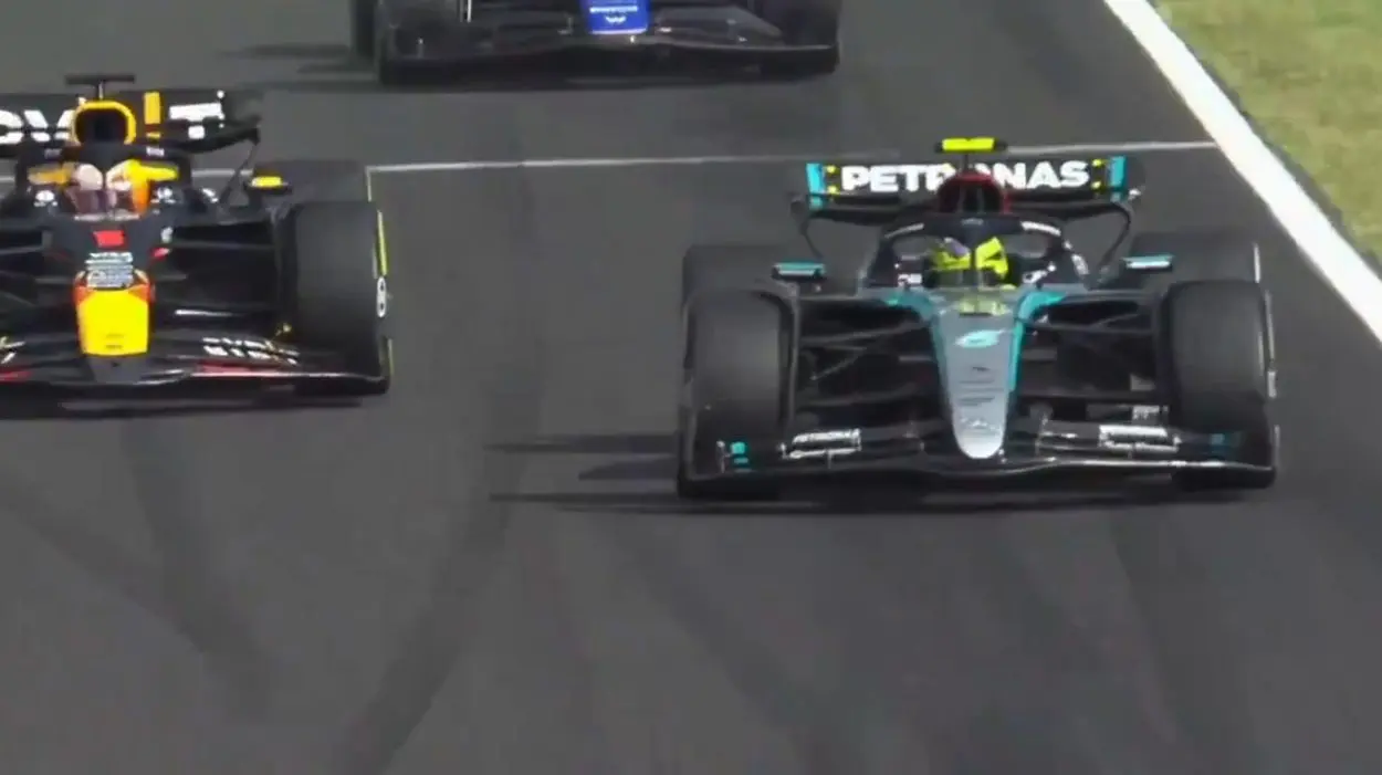 Con los autos uno al lado del otro, la distancia entre las ruedas delanteras y traseras sigue siendo prácticamente idéntica, y Verstappen ya ha corregido ligeramente hacia la derecha para responder a la defensa de Hamilton.