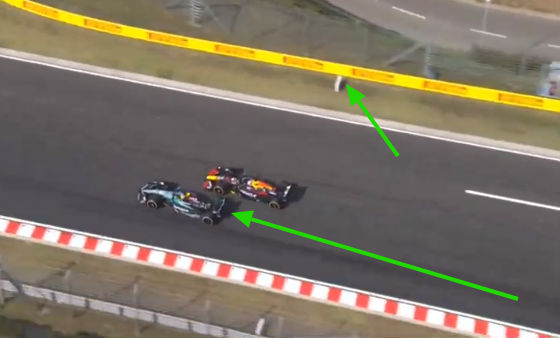 En este punto sucede lo que los Stewards describieron como “Hamilton podría haber hecho más para evitar el contacto”. Es decir, Lewis, en lugar de seguir recto para mantenerse a distancia, gira ligeramente hacia la derecha, teniendo en cuenta al Red Bull que tiene a su lado.