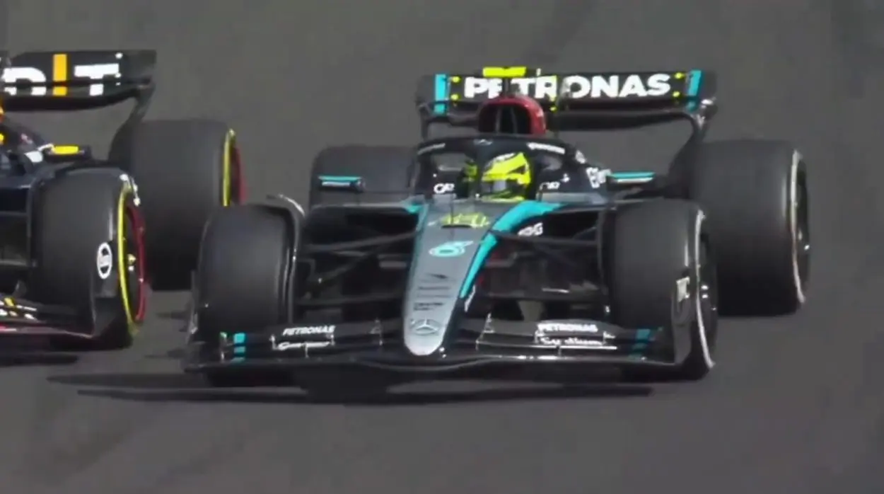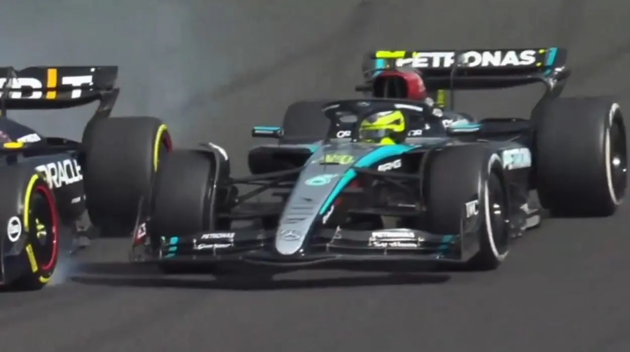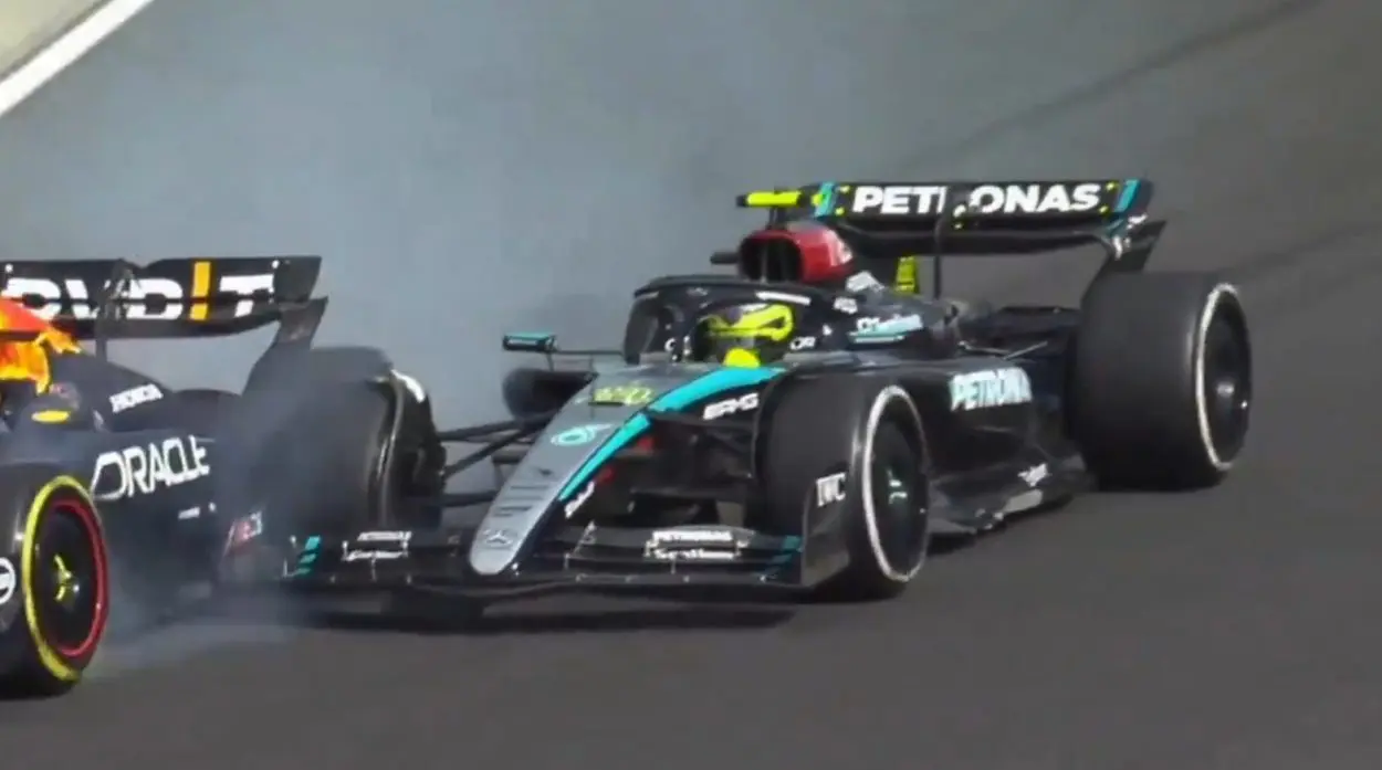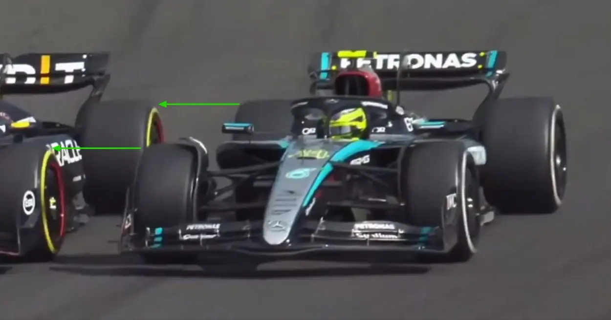 En este caso, la dirección de Hamilton hace que su rueda delantera derecha se alinee con la trasera derecha del Red Bull (incluso el alerón delantero casi toca la parte inferior del RB20), favoreciendo el contacto y haciendo estallar el coche, creando un peligro peligroso y evitable. situación.