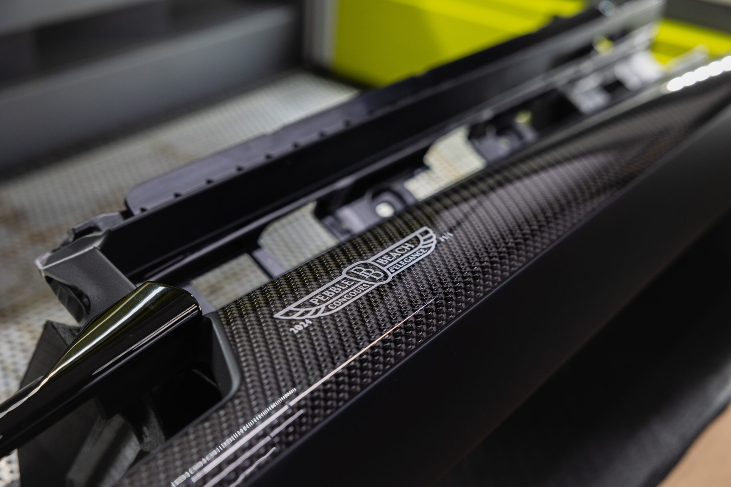 El acabado Carbon Fiber Silver Thread High Gloss con detalles en plata oscura se extiende por el tablero y está adornado con el logotipo Pebble Beach Concours d’Elegance 2024 justo a la derecha de la pantalla curva de BMW, con “#1/1” que no deja dudas sobre la individualidad de este M5. El logotipo y la inscripción #1/1 también están presentes en los umbrales de las puertas delanteras.