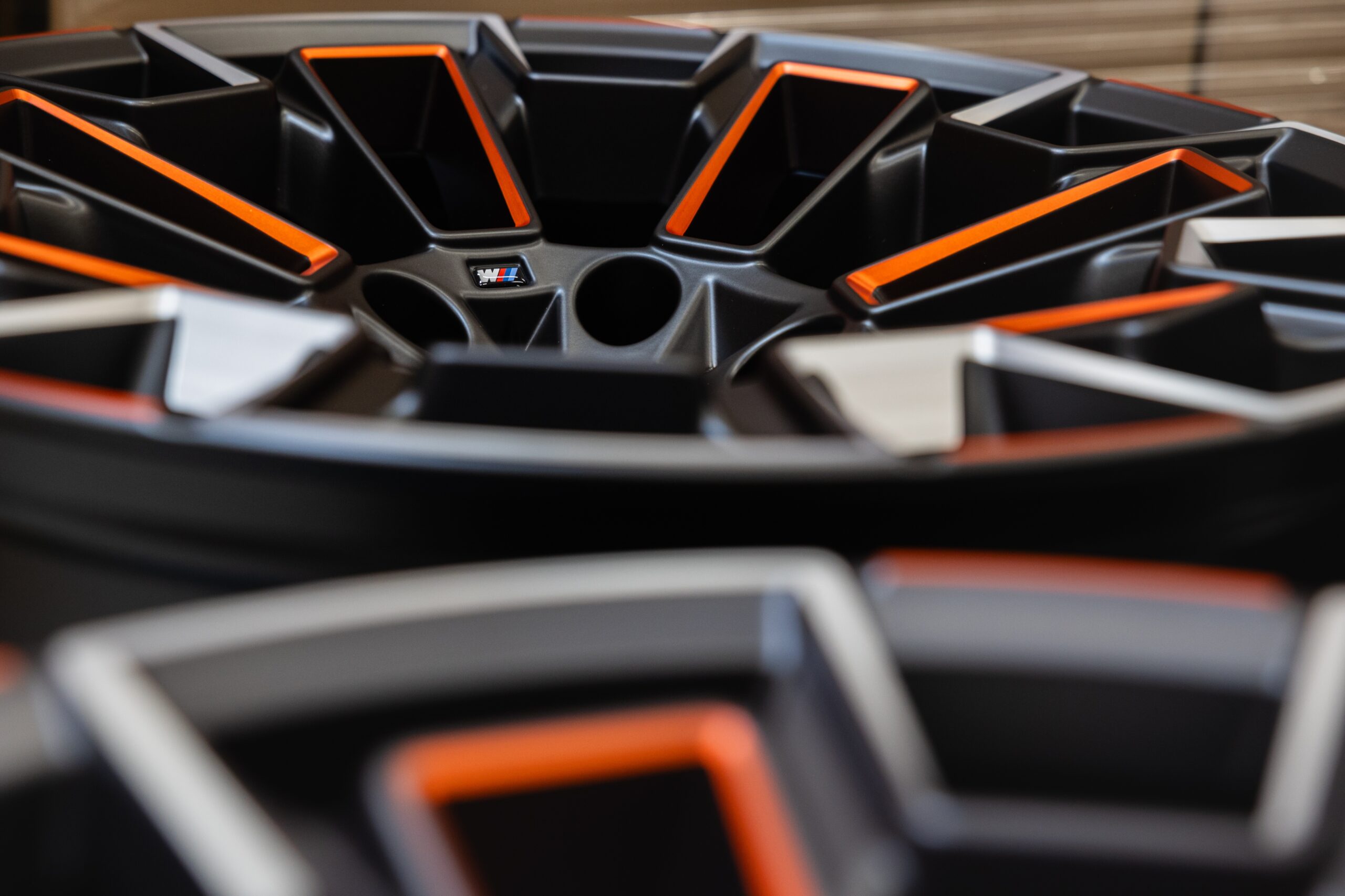 La pintura se complementa con detalles en color naranja pintados a mano en los aros de aleación bicolor M de radios dobles escalonados, estilo 951M, montadas sobre neumáticos de alto rendimiento. Las ruedas delanteras de 20 pulgadas y traseras de 21 pulgadas rodean enormes frenos cerámicos de carbono M con pinzas terminadas en oro mate.