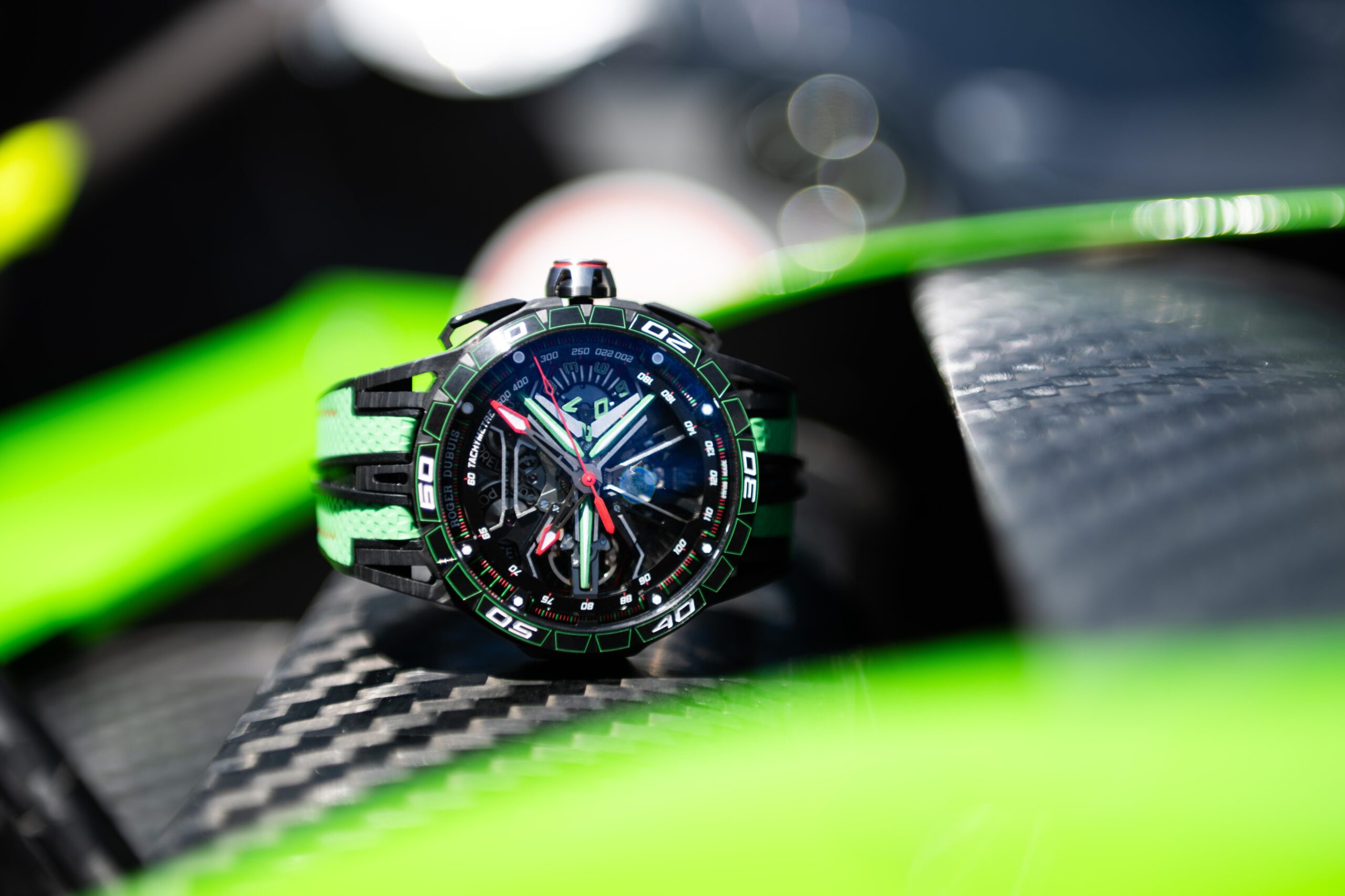 Inspirado en la ingeniería de los superdeportivos, el reloj corre a toda velocidad hacia el futuro de la hipercronología y es un homenaje a la duradera colaboración de Roger Dubuis con Lamborghini Squadra Corse. Para la ocasión, Roger Dubuis ha adornado el nuevo reloj de 45 mm con el mismo tono Verde Mantis que se encuentra en el auto de carreras SC63.