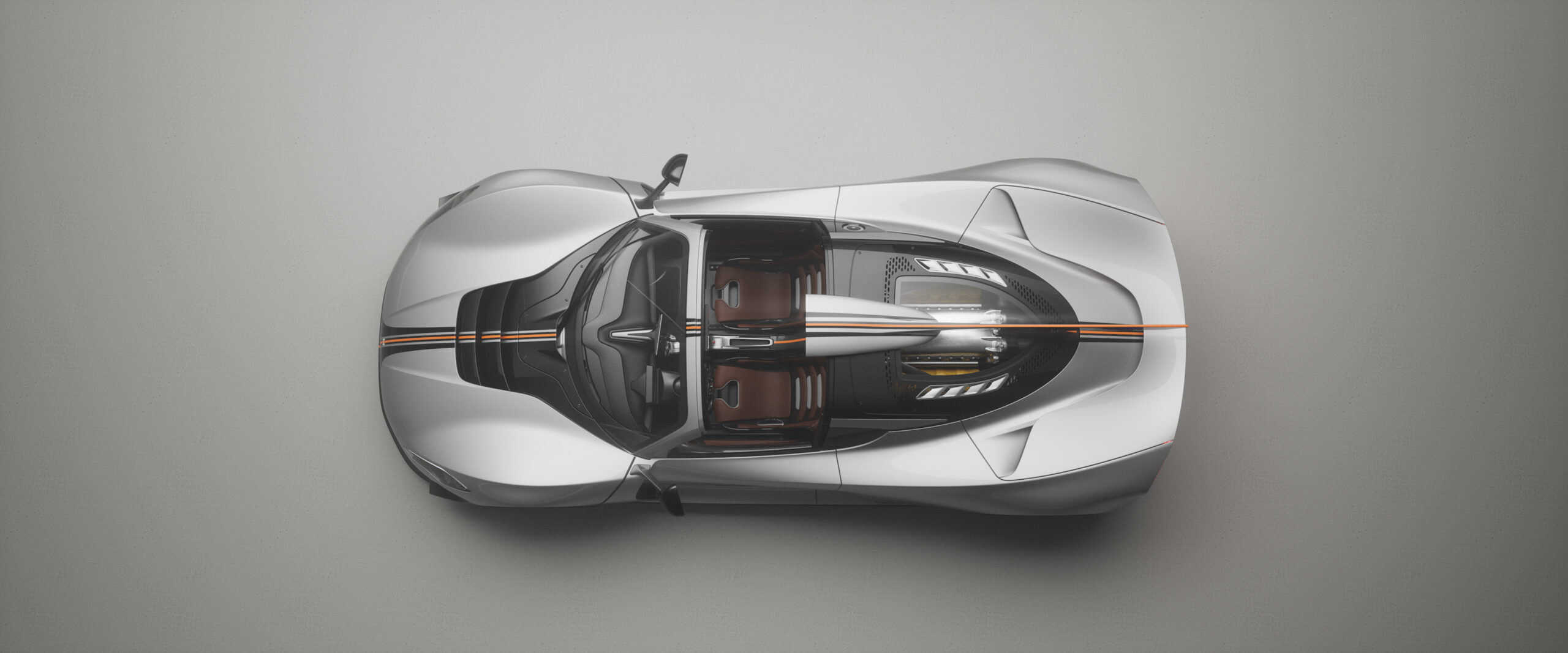 Malinick y su equipo crearon una decoración a medida para el F5-M que acentúa las líneas, enfatiza su techo abierto y se inspira en los diseños tradicionales de los deportes de motor. Desde el frente, Hennessey celebra la artesanía de otro nivel combinando fibra de carbono expuesta con una línea central de color y rayas de acento dobles y contrastantes que fluyen hasta el parabrisas. Las rayas, que continúan sobre el techo, a lo largo de la aleta dorsal, hasta el borde trasero de la tapa del maletero, también conectan el exterior del coche con su cabina, con la «línea de la columna vertebral» reflejada debajo del techo en la consola central.
