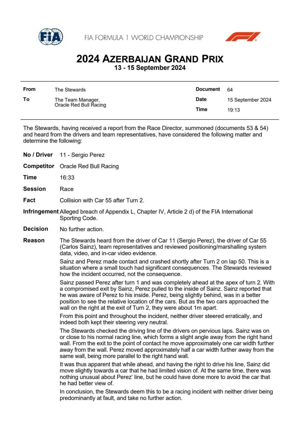 “Los comisarios escucharon al conductor del auto 11 (Sergio Pérez), al conductor del auto 55 (Carlos Sainz), a los representantes del equipo y examinaron los datos del sistema de posicionamiento, los vídeos y las pruebas de vídeo de los autos.