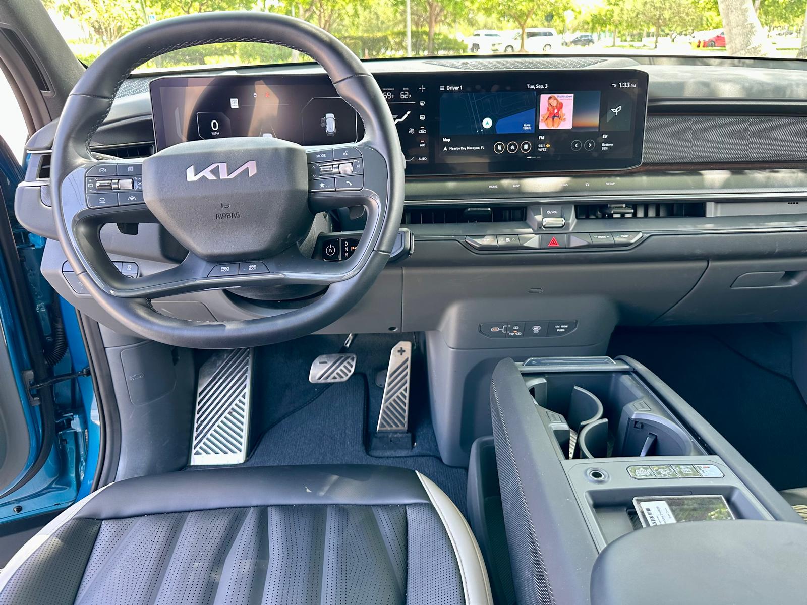 El interior del Kia EV9 destaca por su amplitud y comodidad, con capacidad para hasta siete pasajeros. Los asientos son ajustables y están revestidos con materiales sostenibles, lo que refuerza el compromiso de Kia con el medio ambiente. El diseño del habitáculo es minimalista, pero no sacrifica funcionalidad. El tablero central cuenta con una gran pantalla táctil que integra el sistema de entretenimiento y las funciones del vehículo, ofreciendo una experiencia intuitiva y conectada.
