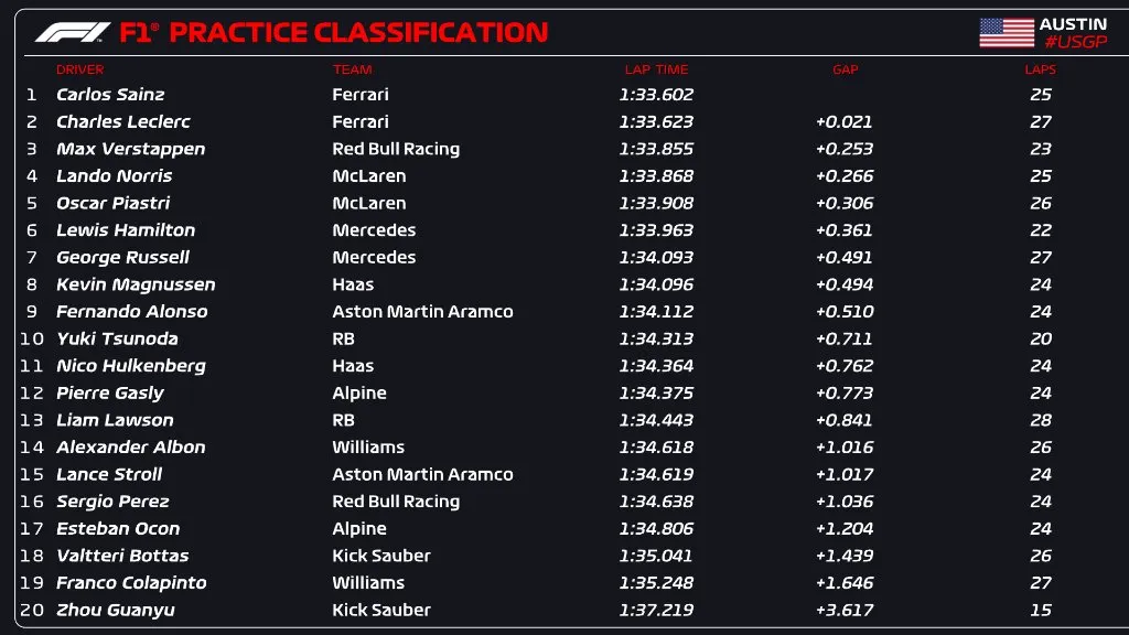 En una sesión en la que esperamos hasta muy tarde antes de ver gomas blandas en pista, los Ferrari de  Carlos SainzCharles Leclerc marcaron los dos mejores tiempos en la única sesión libre del Gran Premio de Estados Unidos, disputada cuatro horas antes de la clasificación al sprint.