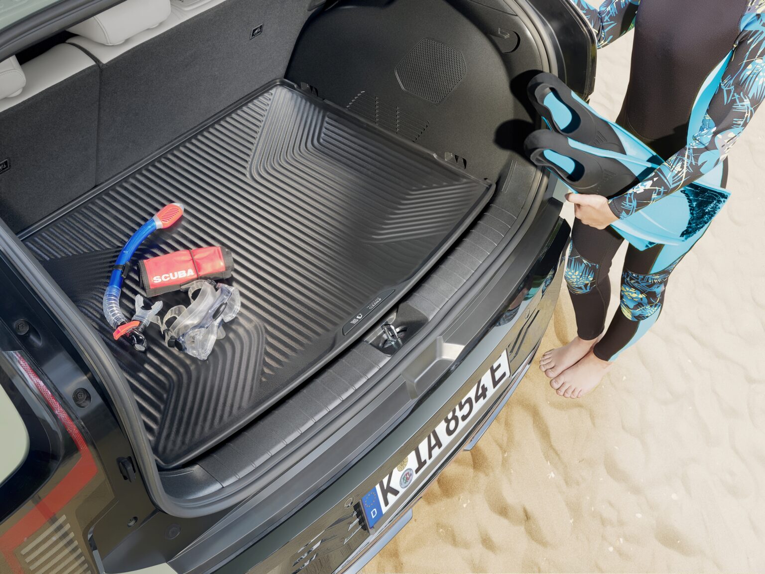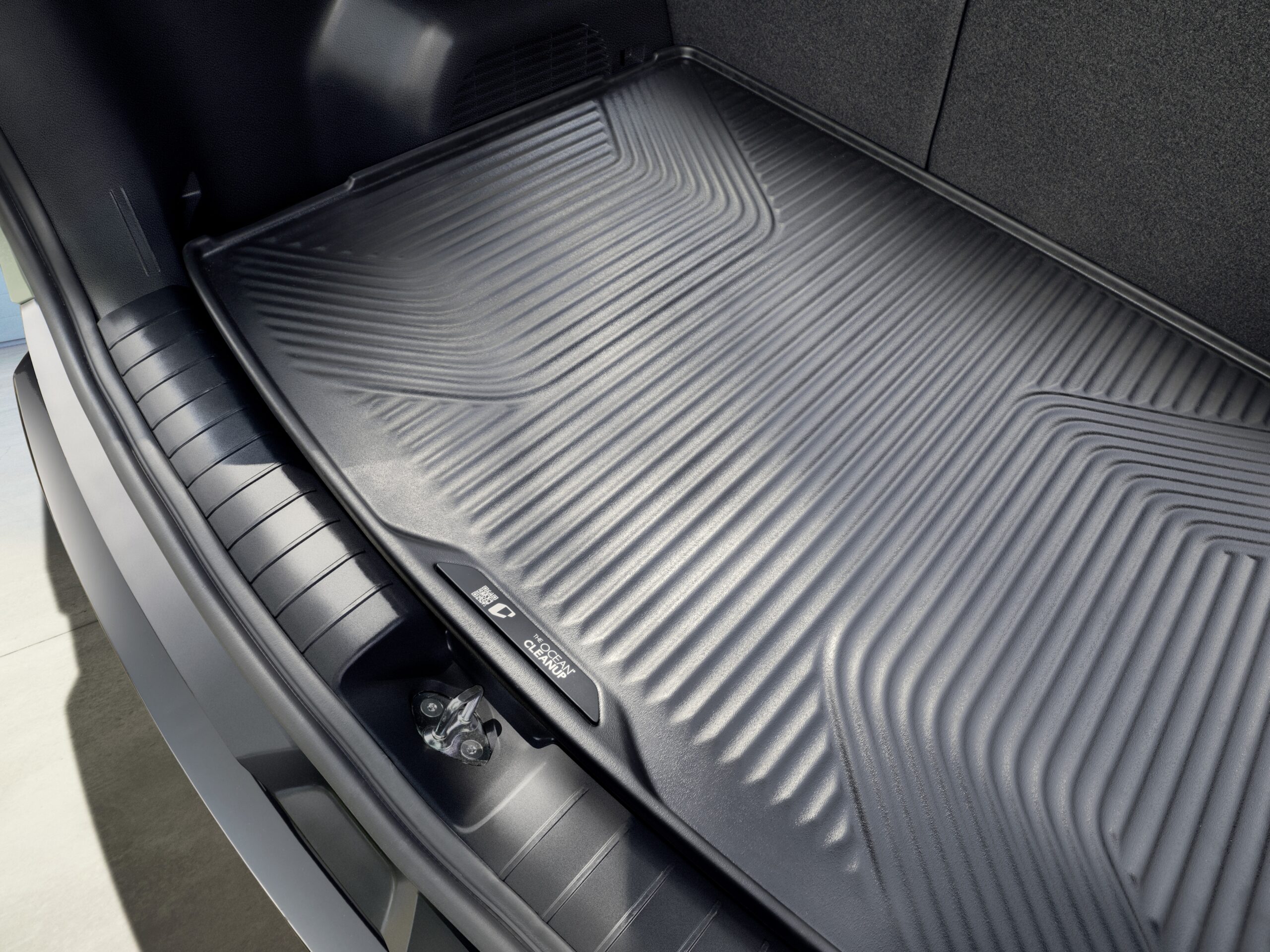 Inspirándose en la filosofía de diseño «Opposites United» de Kia, el patrón de «ondas geométricas» de la superficie superior del revestimiento del maletero recuerda a las olas y al flujo de basura hacia un área de recolección, haciendo eco del proceso de The Ocean Cleanup para extraer plástico marino. Fabricado con un 40 % de plástico oceánico reciclado, el revestimiento del maletero de alta calidad es tan duradero, protector y funcional como un revestimiento de maletero convencional. Cada revestimiento también incluye un código QR, que proporciona a los clientes información detallada sobre el desarrollo del producto y la asociación, así como el logotipo de The Ocean Cleanup.