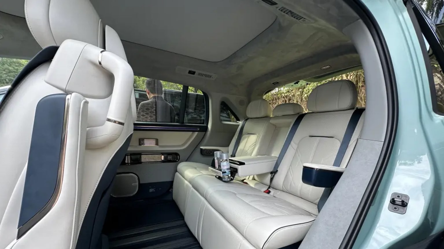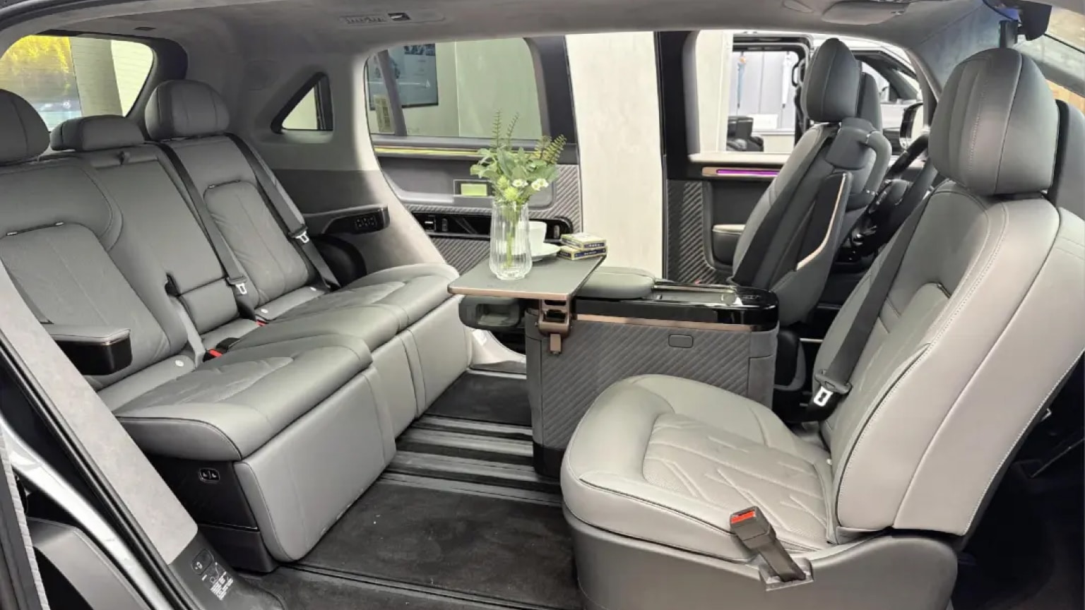 Las minivans Zeekr Mix que se muestran tienen tres colores interiores: gris, blanco y beige. Cada vehículo tiene un techo de gamuza y un gran techo corredizo. La segunda fila del vehículo tiene tres asientos. Cada uno de ellos está equipado con reposapiés eléctricos. Los asientos delanteros del Zeekr Mix pueden girar para mirar hacia los pasajeros traseros. Y el túnel central se puede transformar en una mesa.
