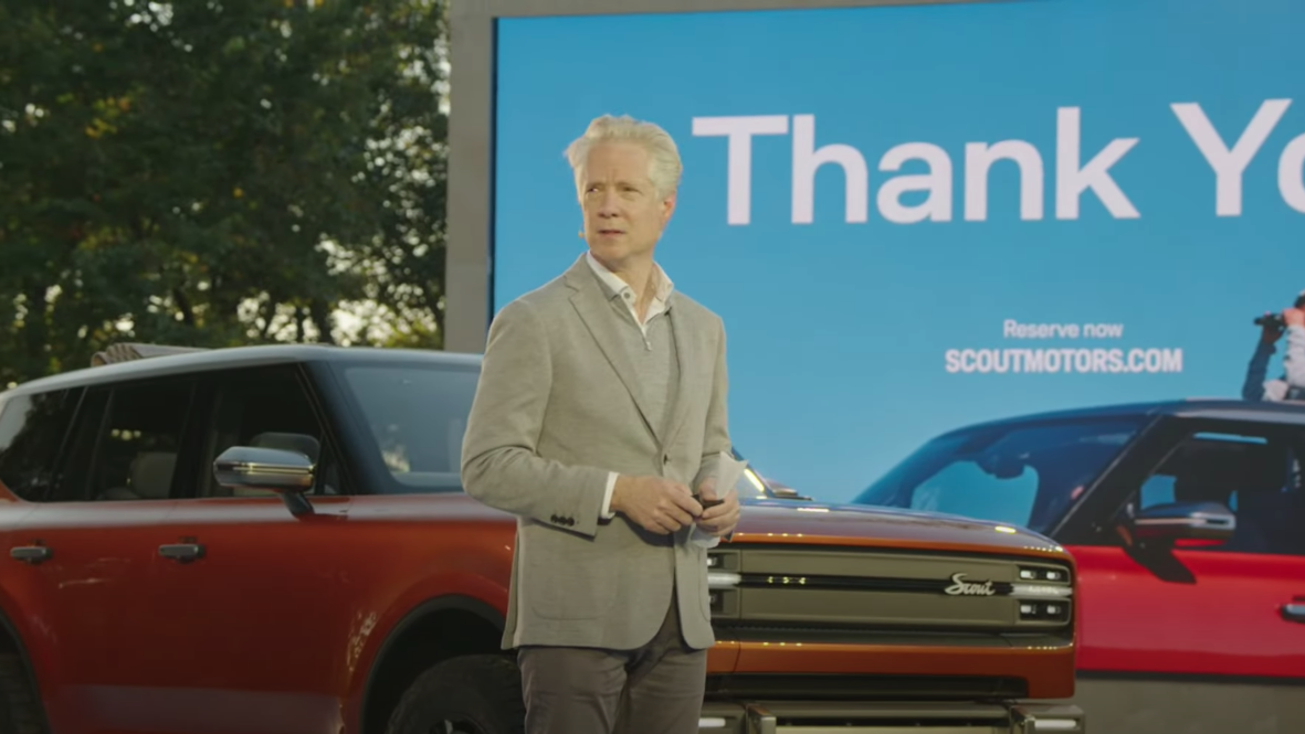 El interior recuerda al del Traveler, con colores brillantes y modernos al estilo de los años 70 y un par de pantallas complementadas con diales y botones físicos. El Scout parece diferenciarse de marcas como Rivian y Tesla al prometer una sensación táctil, que incluye manijas mecánicas en las puertas interiores. Si bien la interfaz principal será a través de dos pantallas, notamos con gran diversión que el panel de instrumentos tiene una reproducción en video del velocímetro estilo cinta que se usaba en los viejos Scouts.