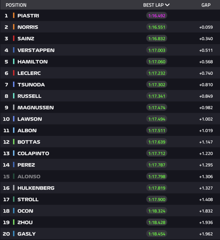 Mientras Carlos Sainz y Charles Leclerc parecían en buena forma, Lando Norris y Oscar Piastri, calzando un nuevo juego de neumáticos blandos, fueron los encargados de arrebatarles las dos primeras posiciones. Norris primero tomó la delantera con 0.281 por delante de Sainz antes de que Piastri mejorara en 59 milésimas con una mejor vuelta de 1’16.492.