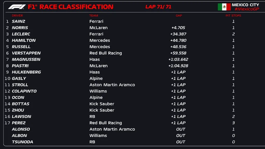 Carlos Sainz dominó el Gran Premio de la Ciudad de México para lograr una segunda victoria consecutiva de Ferrari después de que el líder del título, Max Verstappen, cumpliera una penalización de 20 segundos por una desagradable serie de incidentes iniciales con el contendiente al campeonato, Lando Norris.