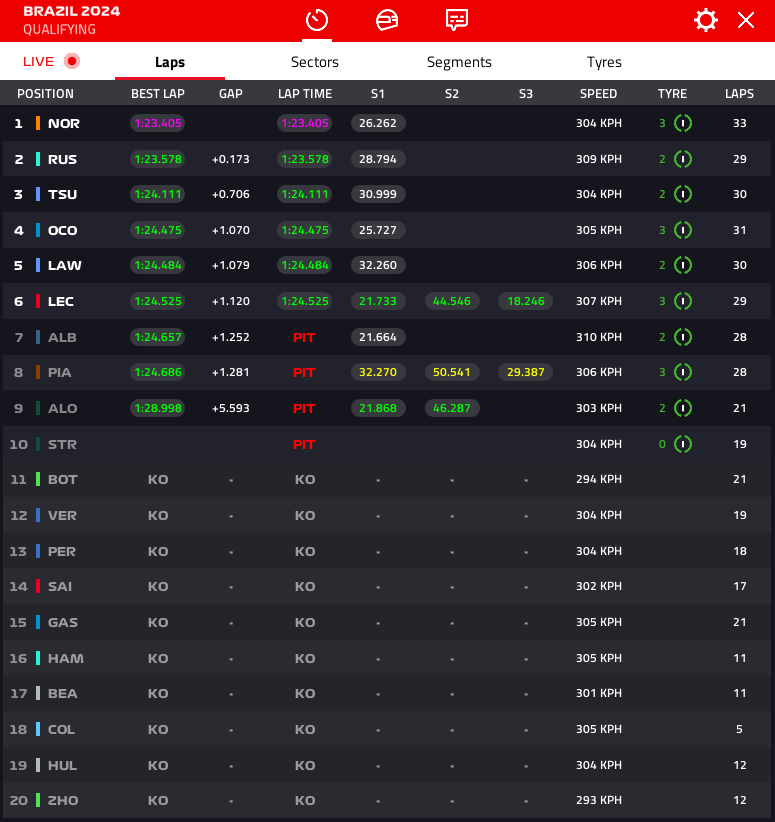 La Q2 fue el momento de cruce entre los maxi rain utilizados en la Q1 y los intermedios, de los cuales Oscar Piastri fue el primero en demostrar que eran los más rápidos a mitad de sesión. Este es también el momento en el que Carlos Sainz (14º) cometió un error en las eses de Senna, perdiendo el agarre en la curva 2, al cambiar a neumáticos verdes. ¿Tendrán tiempo los mecánicos de la Scuderia para reparar los daños a tiempo?