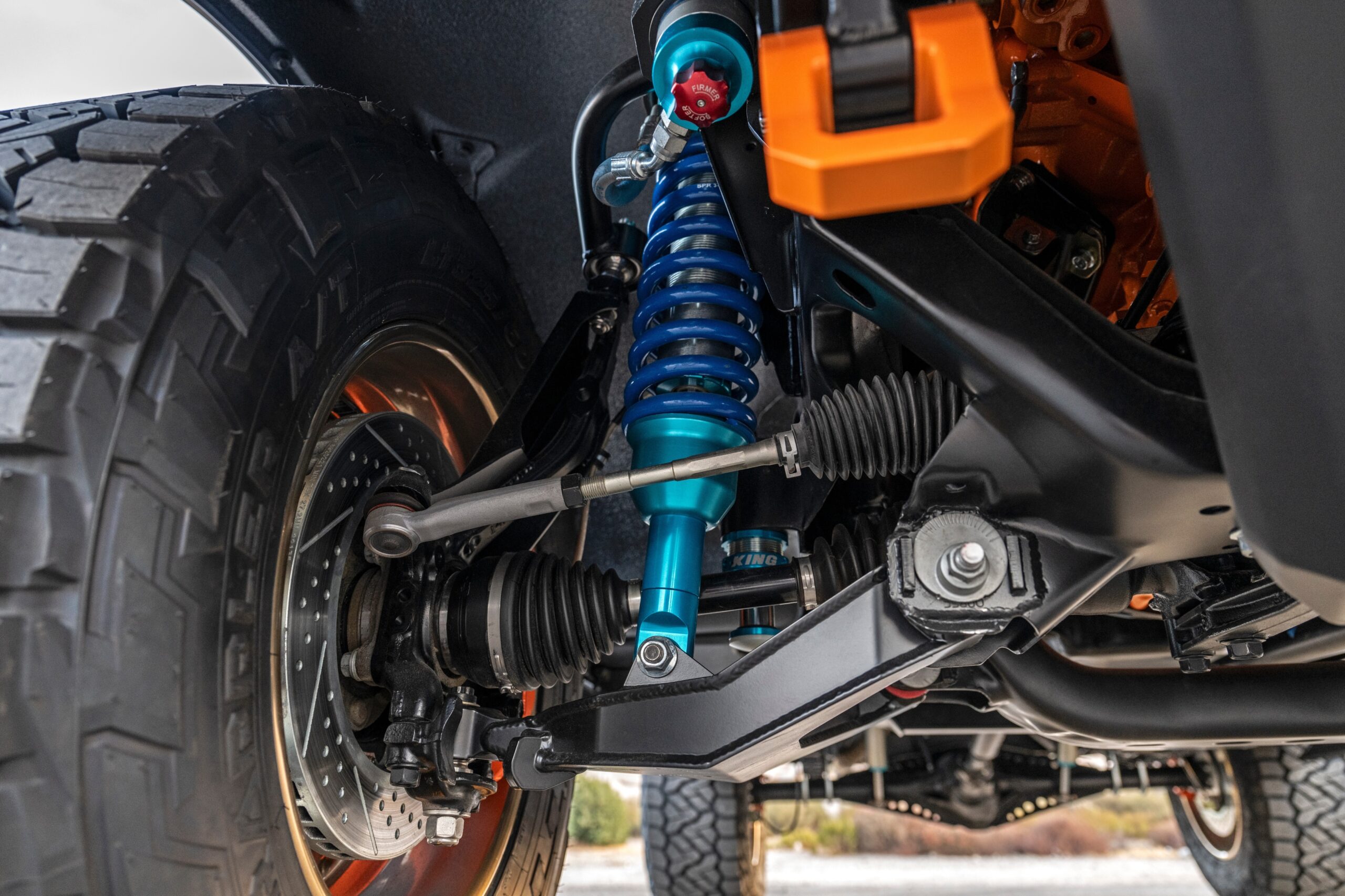 Debajo del capó de fibra de carbono de Ringbrothers se encuentra un V8 LS3 de 6.2 litros GM Performance de 525 caballos de fuerza que canaliza 487 ft-lbs de torque al suelo a través de una transmisión automática Bowler Tru-Street GM 4L60E y una caja de transferencia NP208. De manera única, TUKA incorpora elementos de chasis líderes en su clase de un Tacoma de tercera generación con la suspensión delantera independiente de Toyota modificada para este propósito con brazos de control Total Chaos y una suspensión trasera personalizada con amortiguadores King instalados en todas partes. El Blazer se desplaza sobre un juego de ruedas de bronce de 18 pulgadas únicas de HRE y cuenta con un soporte de rueda de repuesto personalizado detrás del asiento trasero.